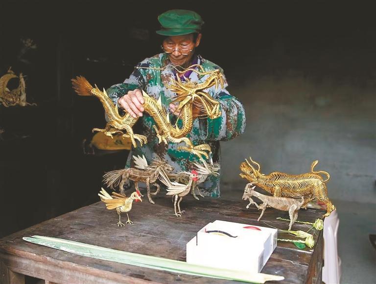 ▲余木兵与其自制的十二生肖动物 偶然走红 祖孙携手推广非遗 从12岁学艺至今,余木兵潜心钻研棕编这门手艺已经整整63年。作为土家棕编第五代传承人,他的作品小到花鸟鱼虫、大到龙凤呈祥,都惟妙惟肖、令人惊叹。然而,很长一段时间里,这门手艺都面临着“酒香也怕巷子深”的困境。关注棕编的人越来越少,鲜有人愿意花时间沉下心来钻研这“慢手艺”。