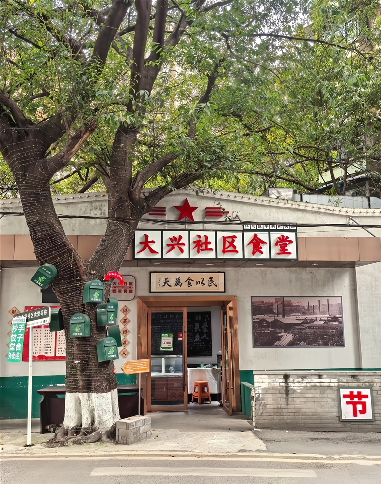 石油路社区食堂对外卖小哥等人群也有优惠 食堂对外卖小哥、60岁以上和80岁以上老人尤其照顾,推出12元、14.9元和晚餐低至9.9元的专属爱心价格。 该食堂自去年10月开业,其间,一些餐馆老板去取经,都摇摇头说“这种模式赚不到大钱”。对于同行的不看好,该食堂负责人张涛坦言该模式利润微薄,但他强调:“食堂具备可持续经营的条件。” 在这个社区食堂里,街道与企业共同在发力。场地,由街道提供,重庆牧有货公司投入350余万元,将闲置房屋改造成集助餐、康养、生鲜于一体的综合服务体;食材,依托重庆牧有货公司自有的绿色供应链,每日新鲜配送;销路,一方面通过街道引介,将用餐信息接入“智慧石油路”微信公众号中的“幸福宝”小程序,推荐社区居民线上预订,另一方面,积极与外卖平台深度合作,相继对“外卖族”推出多项盲盒套餐。 石油路街道民政服务工作人员钱女士告诉记者,街道大力支持社区食堂的运营,为其争取到电、气执行养老机构用价优惠等政策补贴。另在食堂备案后,每季度可根据运营情况申领运营补贴,备案一年后则可以申领建设补贴。 怀旧风装修 “圈粉”喜爱打卡的年轻人 近来,一些年轻人发现了一个小众的“网感地”——两江新区华新街街道大兴社区食堂。该食堂不仅设在一棵历经七八十年风雨的黄葛树下,周边还承载着重钢第三钢铁厂的老厂记忆。