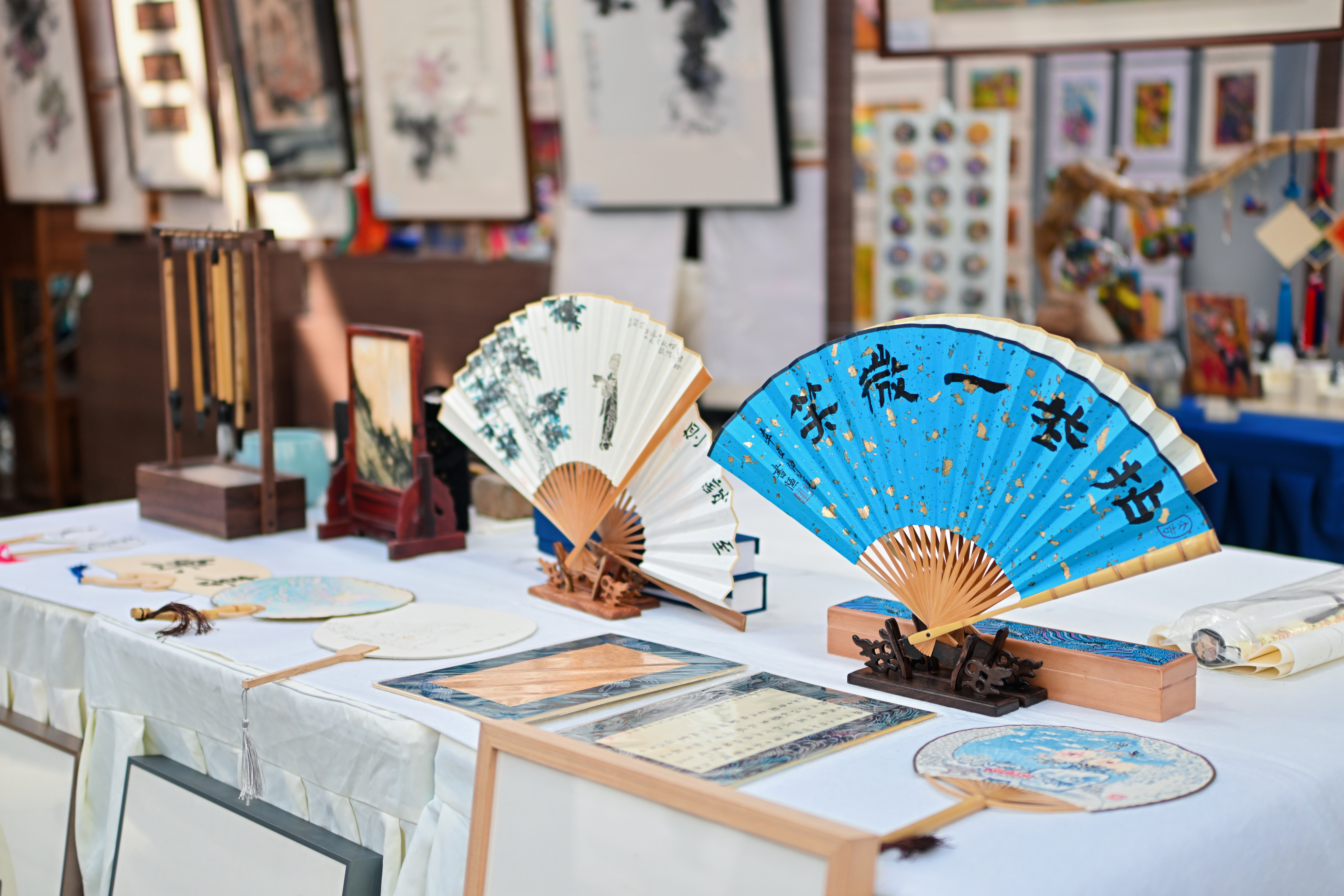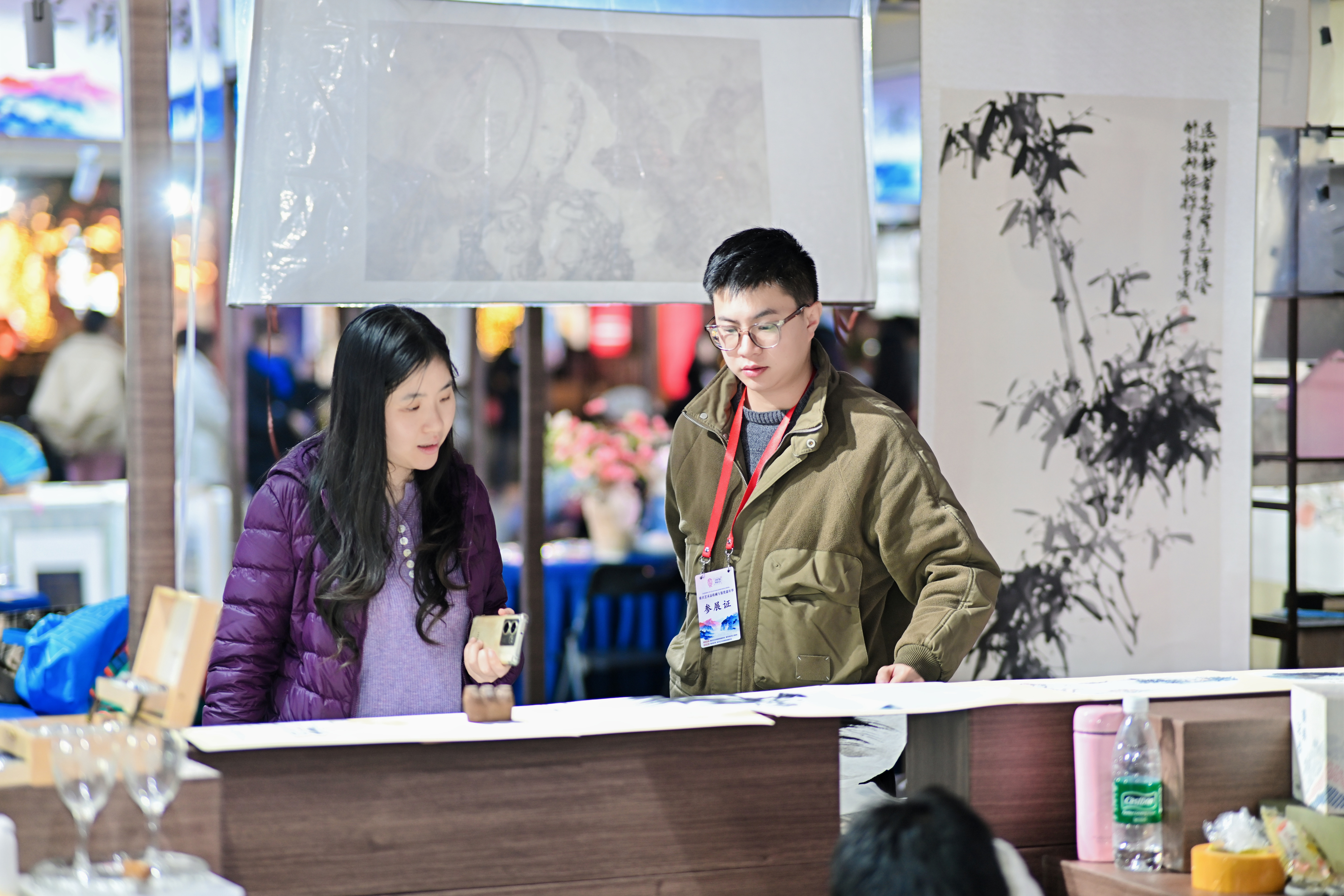 众多深耕传统艺术的机构与个人也带来了丰富的展品。重庆老字号淳辉阁带来的写意国画,文古堂展出的四川省美协理事范昌炯的山水画作品,半山书院、安若书法带来的书法作品及书法文创产品,华夏六艺、艺树一心美育馆的中国画、书法和手写春联,让传统书画艺术更贴近生活场景。