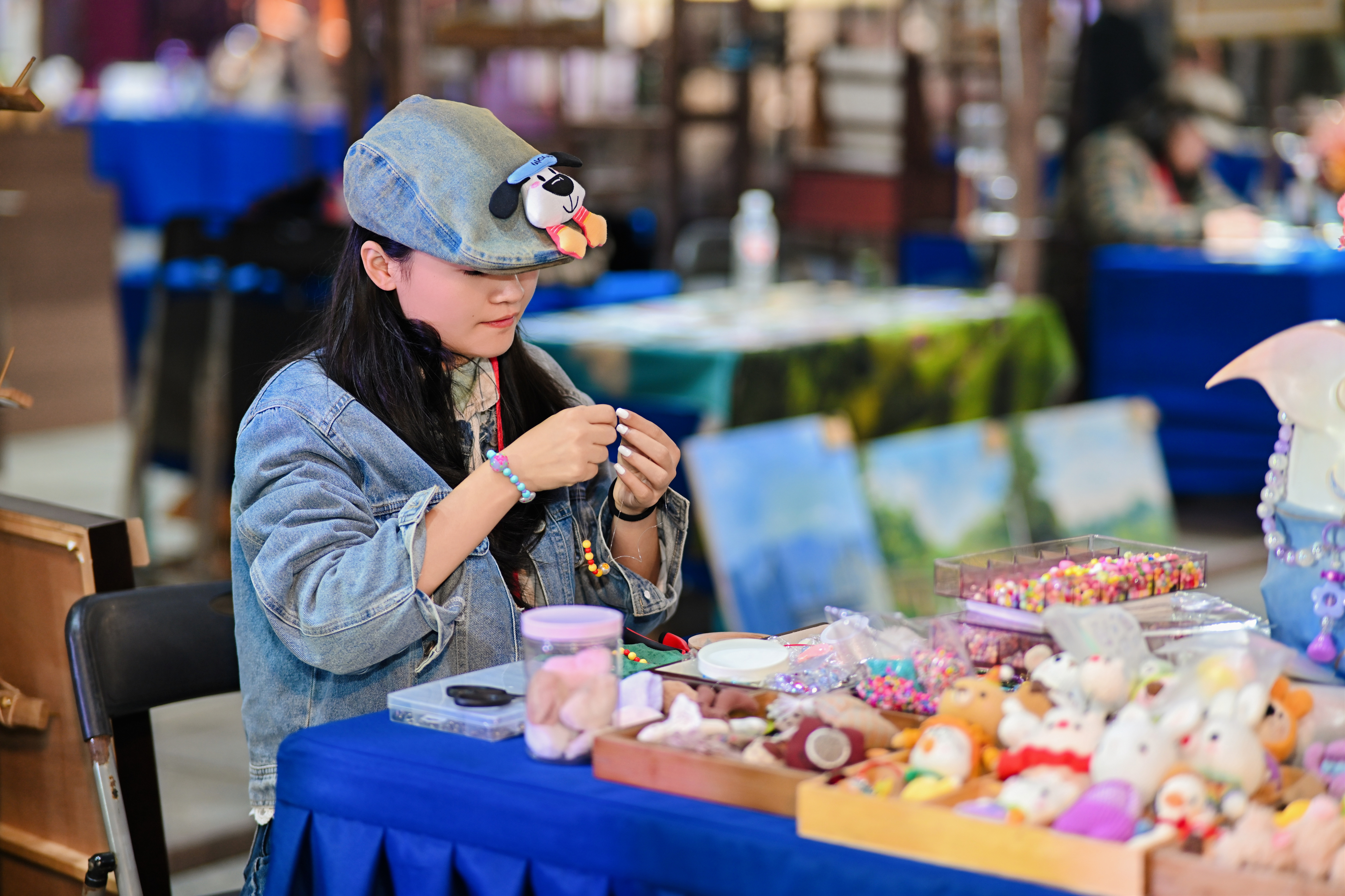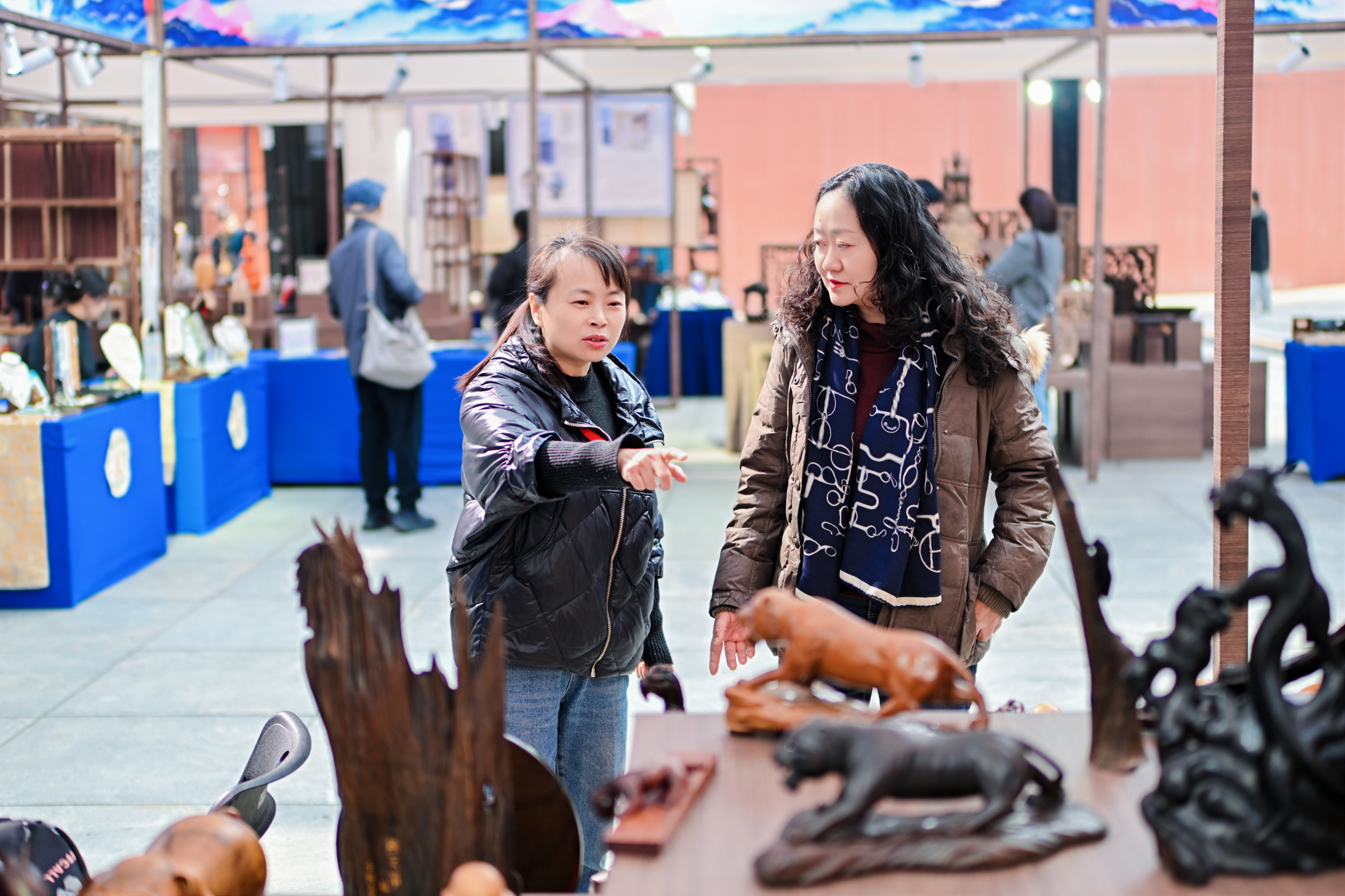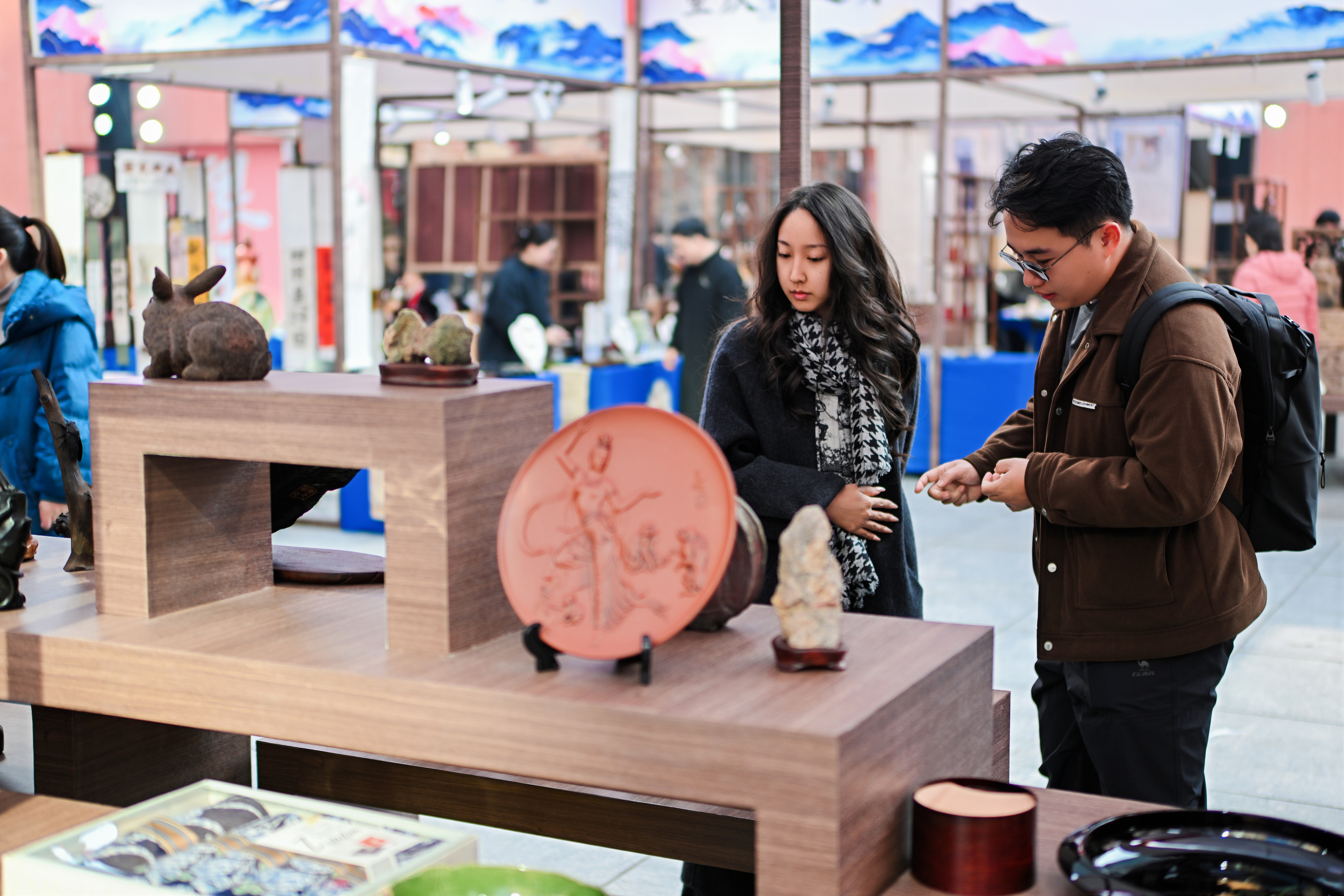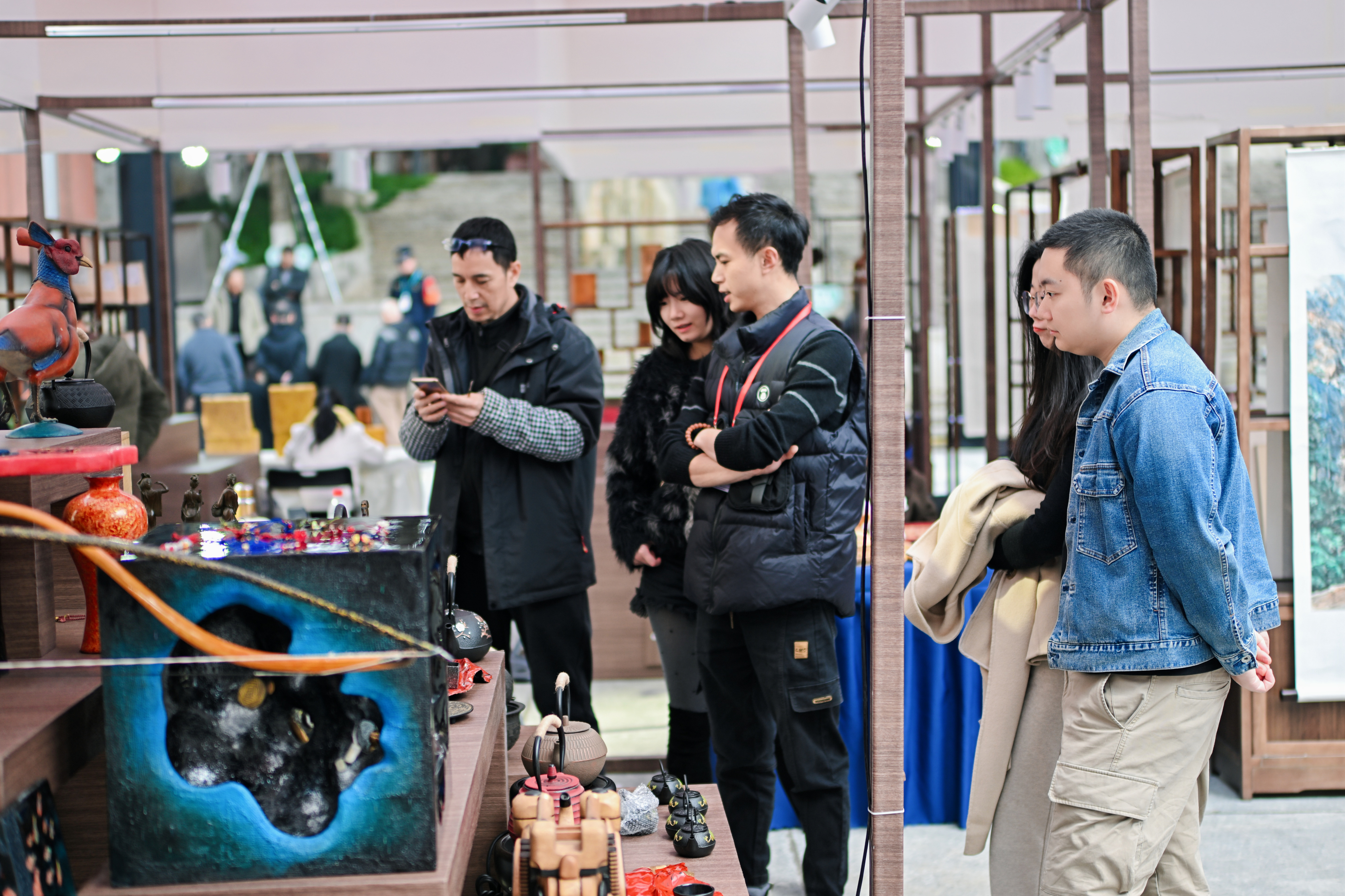 沙坪坝博物馆携嵌瓷文创体验包、传统木工积灯、特色雨伞、文创书签等系列产品亮相,兼具传统工艺传承与实用价值,还可以现场选购;宝林博物馆带来馆藏册页与手工文创,还设置了香道、中医、中式手工等非遗体验项目;春生润文博本次展出古代刺绣文博、养生香与茶道、大型瓷塑人物组雕《水浒108将》三大主题文博系列;磁器口琴磁空间展出各式古琴、古陶瓷,搭配名家字画,营造“琴瓷和鸣”的古典意境;“渝派漆艺”艺术馆则带来复刻故宫珍品、大师亲制屏风等雕漆展品。