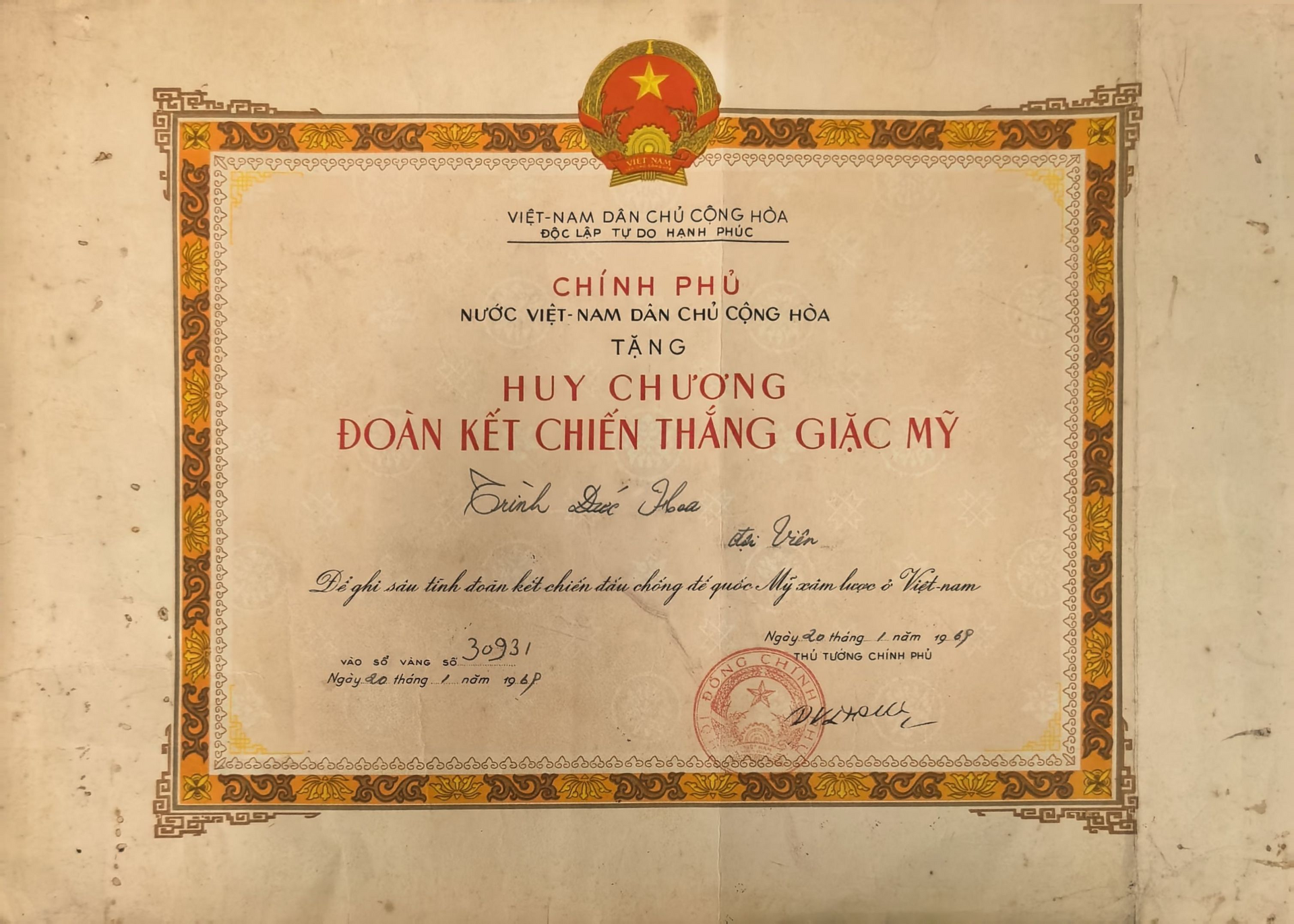 日前,重庆红岩革命历史博物馆又收到一套珍贵藏品——1969年越南政府颁发的“团结战胜美帝”徽章、证书及“八五”纪念章,金属徽章略显褪色,证书字面却清晰如新。 自此,来自红岩博物馆文物部的文物修复专家、中共党员程廉也揭开了父亲尘封半个多世纪的“秘密荣光”。1968 年,身为重庆市歌舞团骨干的父亲奉命赴越,秘密开展文化援助,次年回国前夕荣获越南政府颁发的一套奖章及证书,证书上有时任越南政府总理范文同的亲笔签名。“父亲从未张扬过这段经历,但他教我党员要勇担使命。”程廉的捐赠,为援越抗美这段历史补充了生动物证。