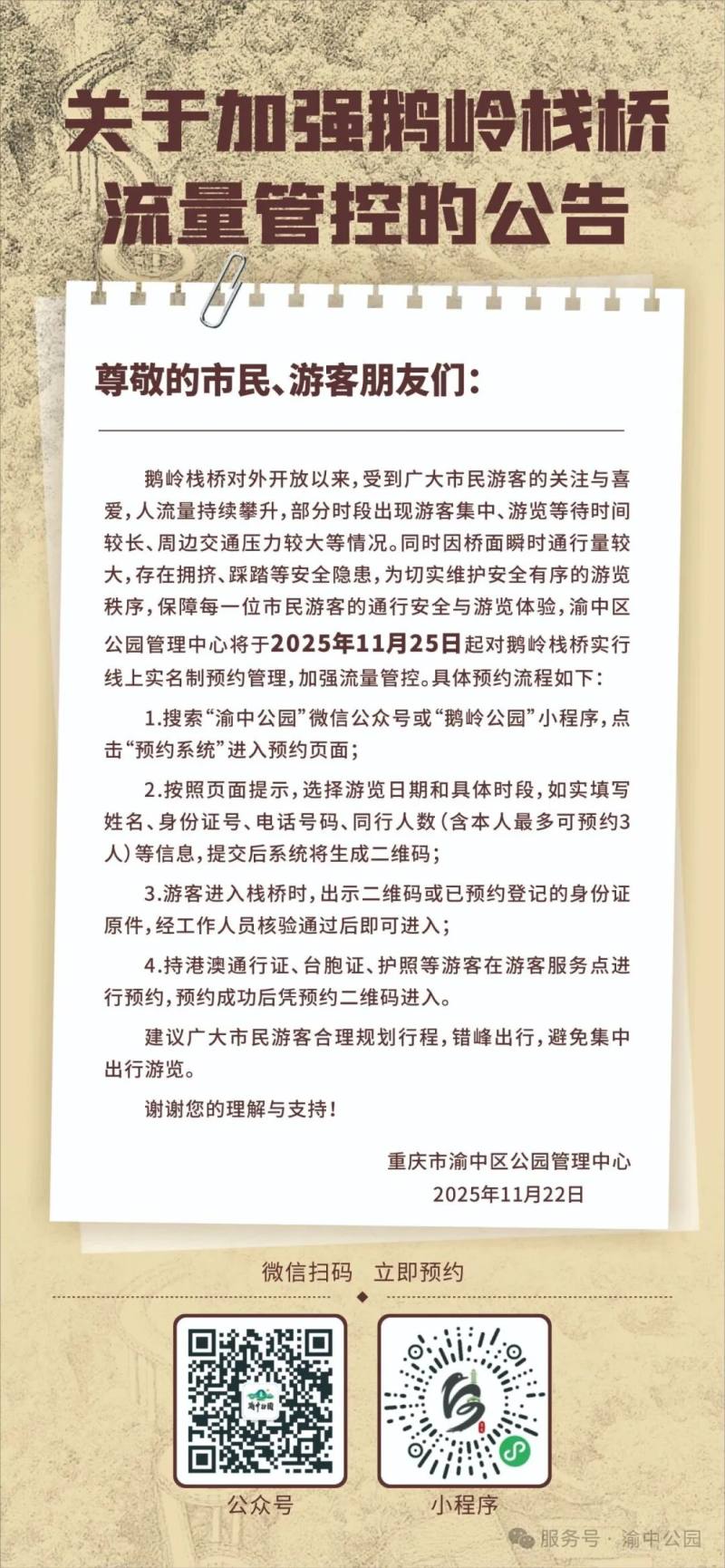 原标题:关于加强鹅岭栈桥流量管控的公告