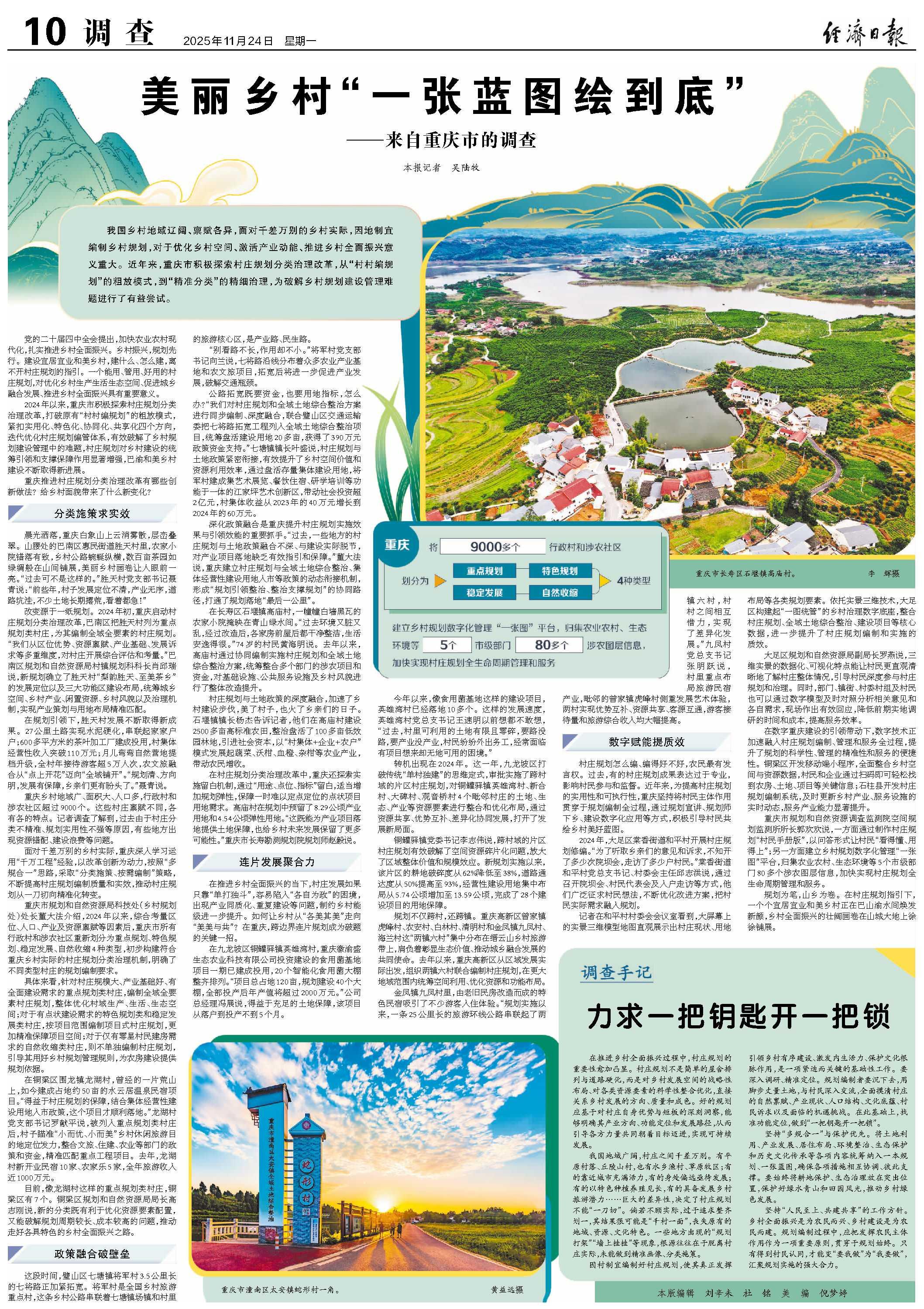 我国乡村地域辽阔、禀赋各异,面对千差万别的乡村实际,因地制宜编制乡村规划,对于优化乡村空间、激活产业动能、推进乡村全面振兴意义重大。近年来,重庆市积极探索村庄规划分类治理改革,从“村村编规划”的粗放模式,到“精准分类”的精细治理,为破解乡村规划建设管理难题进行了有益尝试。 党的二十届四中全会提出,加快农业农村现代化,扎实推进乡村全面振兴。乡村振兴,规划先行。建设宜居宜业和美乡村,建什么、怎么建,离不开村庄规划的指引。一个能用、管用、好用的村庄规划,对优化乡村生产生活生态空间、促进城乡融合发展、推进乡村全面振兴具有重要意义。 2024年以来,重庆市积极探索村庄规划分类治理改革,打破原有“村村编规划”的粗放模式,紧扣实用化、特色化、协同化、共享化四个方向,迭代优化村庄规划编管体系,有效破解了乡村规划建设管理中的难题,村庄规划对乡村建设的统筹引领和支撑保障作用显著增强,巴渝和美乡村建设不断取得新进展。 重庆推进村庄规划分类治理改革有哪些创新做法?给乡村面貌带来了什么新变化? 分类施策求实效 晨光洒落,重庆白象山上云消雾散,层峦叠翠。山腰处的巴南区惠民街道胜天村里,农家小院错落有致,乡村公路蜿蜒纵横,数百亩茶园如绿绸般在山间铺展,美丽乡村画卷让人眼前一亮。“过去可不是这样的。”胜天村党支部书记聂青说:“前些年,村子发展定位不清,产业无序,道路坑洼,不少土地长期撂荒,看着都急!” 改变源于一纸规划。2024年初,重庆启动村庄规划分类治理改革,巴南区把胜天村列为重点规划类村庄,为其编制全域全要素的村庄规划。“我们从区位优势、资源禀赋、产业基础、发展诉求等多重维度,对村庄开展综合评估和考量。”巴南区规划和自然资源局村镇规划科科长肖邱瑞说,新规划确立了胜天村“梨韵胜天、至美茶乡”的发展定位以及三大功能区建设布局,统筹城乡空间、乡村产业、闲置资源、乡村风貌以及治理机制,实现产业策划与用地布局精准匹配。 在规划引领下,胜天村发展不断取得新成果。27公里土路实现水泥硬化,串联起家家户户;600多平方米的茶叶加工厂建成投用,村集体经营性收入突破110万元;月儿弯弯自然营地提档升级,全村年接待游客超5万人次,农文旅融合从“点上开花”迈向“全域铺开”。“规划清、方向明,发展有保障,乡亲们更有盼头了。”聂青说。 重庆乡村地域广、面积大、人口多,行政村和涉农社区超过9000个。这些村庄禀赋不同,各有各的特点。记者调查了解到,过去由于村庄分类不精准、规划实用性不强等原因,有些地方出现资源错配、建设浪费等问题。 面对千差万别的乡村实际,重庆深入学习运用“千万工程”经验,以改革创新为动力,按照“多规合一”思路,采取“分类施策、按需编制”策略,不断提高村庄规划编制质量和实效,推动村庄规划从一刀切向精准化转变。 重庆市规划和自然资源局科技处(乡村规划处)处长董大法介绍,2024年以来,综合考量区位、人口、产业及资源禀赋等因素后,重庆市所有行政村和涉农社区重新划分为重点规划、特色规划、稳定发展、自然收缩4种类型,初步构建符合重庆乡村实际的村庄规划分类治理机制,明确了不同类型村庄的规划编制要求。 具体来看,针对村庄规模大、产业基础好、有全面建设需求的重点规划类村庄,编制全域全要素村庄规划,整体优化村域生产、生活、生态空间;对于有点状建设需求的特色规划类和稳定发展类村庄,按项目范围编制项目式村庄规划,更加精准保障项目空间;对于仅有零星村民建房需求的自然收缩类村庄,则不单独编制村庄规划,引导其用好乡村规划管理规则,为农房建设提供规划依据。 在铜梁区围龙镇龙湖村,曾经的一片荒山上,如今建成占地约50亩的水云居温泉民宿项目。“得益于村庄规划的保障,结合集体经营性建设用地入市政策,这个项目才顺利落地。”龙湖村党支部书记罗献平说,被列入重点规划类村庄后,村子瞄准“小而优、小而美”乡村休闲旅游目的地定位发力,整合文旅、住建、农业等部门的政策和资金,精准匹配重点工程项目。去年,龙湖村新开业民宿10家、农家乐5家,全年旅游收入近1000万元。 目前,像龙湖村这样的重点规划类村庄,铜梁区有7个。铜梁区规划和自然资源局局长高志刚说,新的分类既有利于优化资源要素配置,又能破解规划周期较长、成本较高的问题,推动走好各具特色的乡村全面振兴之路。 政策融合破壁垒 这段时间,璧山区七塘镇将军村3.5公里长的七将路正加紧拓宽。将军村是全国乡村旅游重点村,这条乡村公路串联着七塘镇场镇和村里的旅游核心区,是产业路、民生路。 “别看路不长,作用却不小。”将军村党支部书记向兰说,七将路沿线分布着众多农业产业基地和农文旅项目,拓宽后将进一步促进产业发展,破解交通瓶颈。 公路拓宽既要资金,也要用地指标,怎么办?“我们对村庄规划和全域土地综合整治方案进行同步编制、深度融合,联合璧山区交通运输委把七将路拓宽工程列入全域土地综合整治项目,统筹盘活建设用地20多亩,获得了390万元政策资金支持。”七塘镇镇长叶盛说,村庄规划与土地政策紧密衔接,有效提升了乡村空间价值和资源利用效率,通过盘活存量集体建设用地,将军村建成集艺术展览、餐饮住宿、研学培训等功