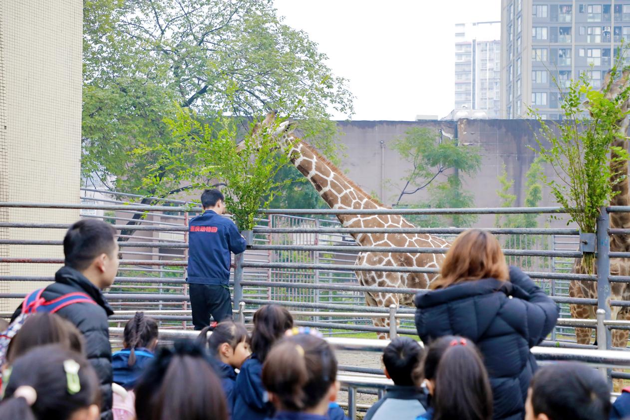 在重庆动物园科普老师陈大冯的带领下,同学们迫不及待地涌向长颈鹿展区,一场充满趣味的科普探索也正式拉开序幕。 “大家仔细观察,长颈鹿走路有什么特点?它们是不是‘同手同脚’?”“还真的是,这太有趣了!”陈大冯的提问,让同学们纷纷瞪大双眼观察。
