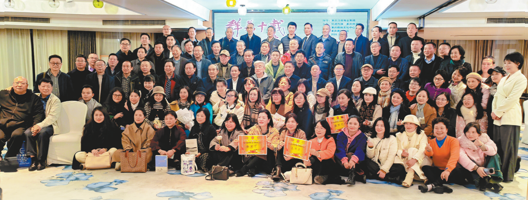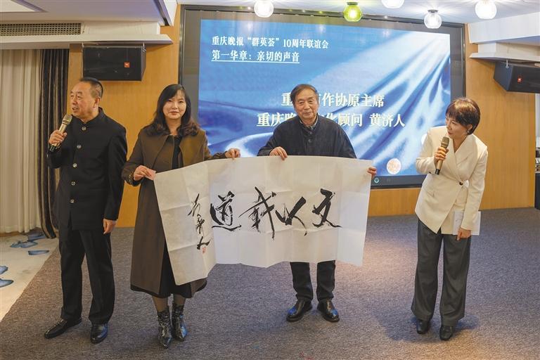 《夜雨》副刊作为重庆晚报的特色版面,自1985年5月1日与报纸同步创刊以来,始终以深厚的人文积淀、真挚的文化情怀与不断创新的办刊理念,被誉为“坚守内容品质、推动融合发展的行业旗帜”。四十年来,《夜雨》作品屡获嘉誉,累计荣获中国新闻奖、重庆新闻奖及各类文学奖项200余次;公开出版《一把粉抹在鼻梁上》《重庆崽儿重庆妹》《秋风吹过的村庄》《从古老的河道醒来》等图书20余种;设立“重庆晚报文学奖”,并聘请贾平凹、舒婷、黄济人、吕进等全国文化名家担任顾问,持续深耕文学沃土生生不息。 “群英荟”作为《夜雨》骨干作者的线上交流平台,自2015年创建以来,已成为作者们创作交流、心灵共鸣的精神家园。本次十周年线下联谊由重庆晚报主办,全程由热心群友自发筹办。画家、散文家常克与散文家杨莉联袂主持,词作家、诗人陈刚更特意为“群英荟”十周年创作歌词《夜雨荟群英》,并现场发布MV,以音画形式凝结情谊。 “盖因春风可化雨,夜雨更浇花。”重庆市作协原主席、重庆晚报文化顾问黄济人先生不仅送上真挚祝福,更带来一幅书法作品《文以载道》,以抽奖方式赠予在场文友,将文化传承的暖意传递至更多人手中。重庆市文联荣誉主席、西南大学二级教授、重庆晚报文化顾问吕进先生也发来贺词:“副刊群英荟,奇花争艳开”。