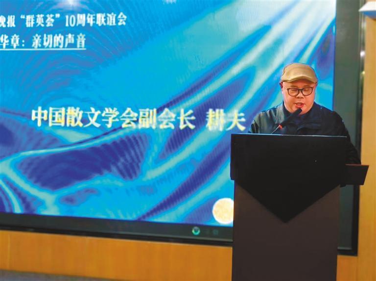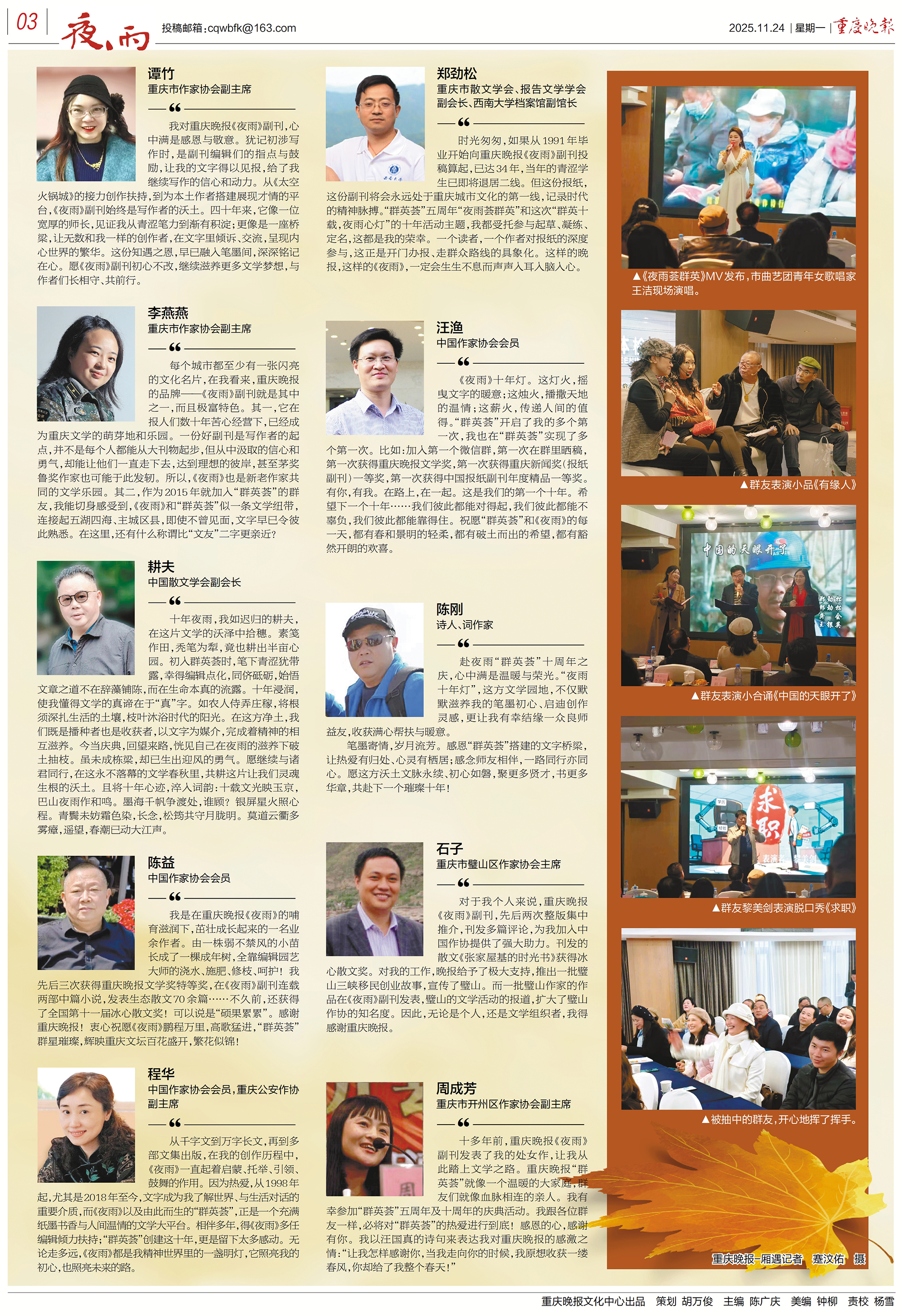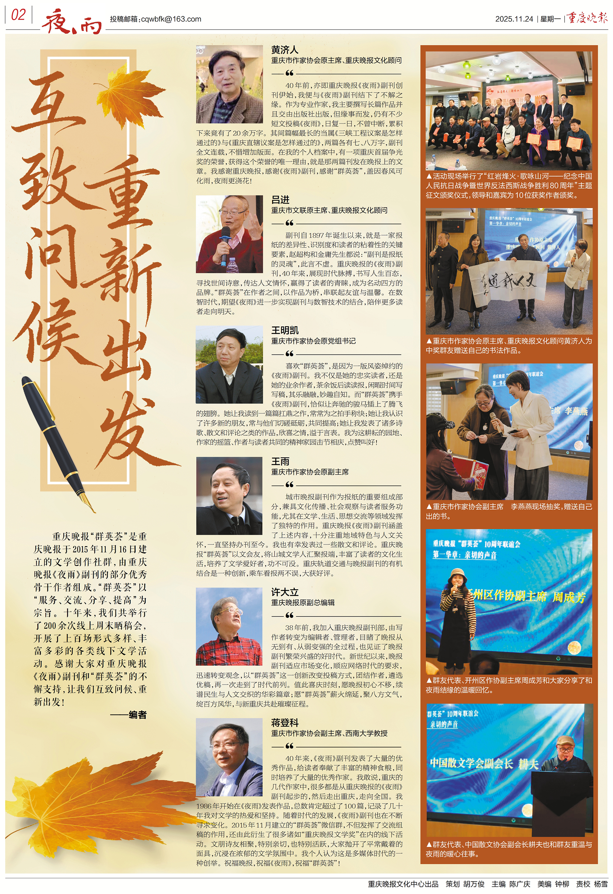 ▲群友代表、中国散文协会副会长耕夫也和群友重温与夜雨的暖心往事。 王明凯、邓高如、许大立、谭竹等晚报资深作者亦冒雨到场,畅叙情谊,共话创作。 据重庆晚报《夜雨》副刊总策划胡万俊介绍,“群英荟”是一个充满欢乐与创作热情的大家庭。十年来,群友们比学赶超、笔耕不辍,在各自领域绽放光彩,先后有200余人加入重庆市作家协会,70余人成为中国作家协会会员。举办的四届晚报文学奖,共有70名群友的122篇优秀作品从上万篇作品中脱颖而出,从一个侧面彰显了重庆文学人才辈出的景象。 重庆晚报总编辑杨飞表示,《夜雨》是巴渝文学的一方沃土,无论时代如何变迁,都能在此找到共鸣与温情。如今,《夜雨》持续创新,开辟《少年说》倾听童言稚语,设立《师说》搭建家校共育桥梁,更尝试与作者共创内容。其中《民主村,烟火深处是吾乡》一文,成为文学与新闻融合的典范之作。 重庆日报报业集团党委委员、副总编辑、重庆晚报编委会主任王亚深情回忆幼时阅读《夜雨》的崇敬心情,就继续办好副刊提出三点愿景:忠实记录时代,始终围绕国之大者,深入市民生活;热情讴歌时代,期望广大副刊作者不断提高素养、学养、涵养,做德艺双馨的文学创作者;奋力引领时代,大力弘扬中国精神、重庆城市精神,坚决摒弃本地文化的糟粕;期待《夜雨》为文化强市、文化强国贡献更多力量。 活动现场还举行了“红岩烽火·歌咏山河——纪念中国人民抗日战争暨世界反法西斯战争胜利80周年”主题征文颁奖仪式,《胜利的狂欢》等十篇佳作致敬历史,礼赞山河。