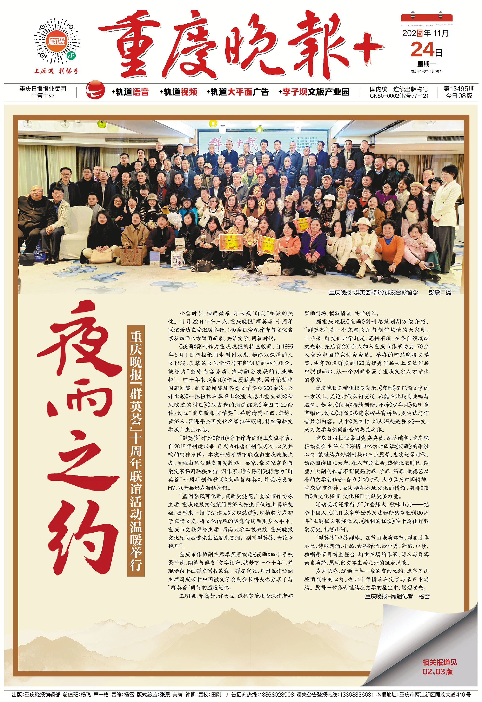 十多年前,重庆晚报《夜雨》副刊发表了我的处女作,让我从此踏上文学之路。重庆晚报“群英荟”就像一个温暖的大家庭,群友们就像血脉相连的亲人。我有幸参加“群英荟”五周年及十周年的庆典活动。我跟各位群友一样,必将对“群英荟”的热爱进行到底!感恩的心,感谢有你。我以汪国真的诗句来表达我对重庆晚报的感激之情:“让我怎样感谢你,当我走向你的时候,我原想收获一缕春风,你却给了我整个春天!” 重庆晚报-厢遇记者 杨雪 蹇汶佑 摄影报道 编辑:戴林 校审:罗再芳 总值班:严一格 重庆晚报夜雨版面赏析