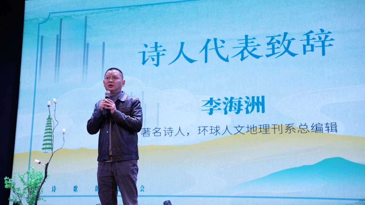 (重庆人文科技学院校长周光明) 诗人代表李海洲在发言中幽默而真挚地回顾了诗歌大赛的评审过程,并高度评价学生作品的成长与潜力。他表示:“今年有七八位同学的诗歌作品,不弱于重庆成熟诗人的水平。”