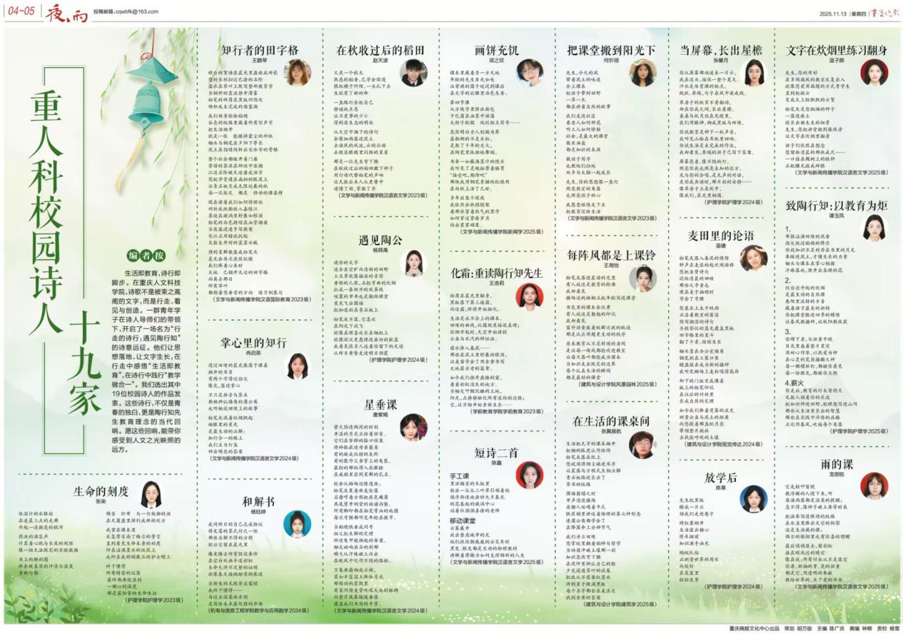(《重庆晚报》整版刊登) 共著《行知诗卷》 早在10月28日,10位著名诗人便受邀走进重人科校园进行采风。在深入了解学校以陶行知教育思想为内核的办学理念与校园文化后,诗人导师们与30位在初赛中脱颖而出的校园诗人“结对子”。 在随后的一对一改稿会上,诗人导师对学生的原创诗作进行了细致指导,从语言表达到意境营造,分享了宝贵的创作经验。这段深入的交流也激发了诗人导师们的创作灵感,他们纷纷提笔,将对校园、对行知精神的感悟,凝结为诗篇。这些由导师与学生共同创作、修订的诗歌,最终被集结收录到《2025行知诗卷》。