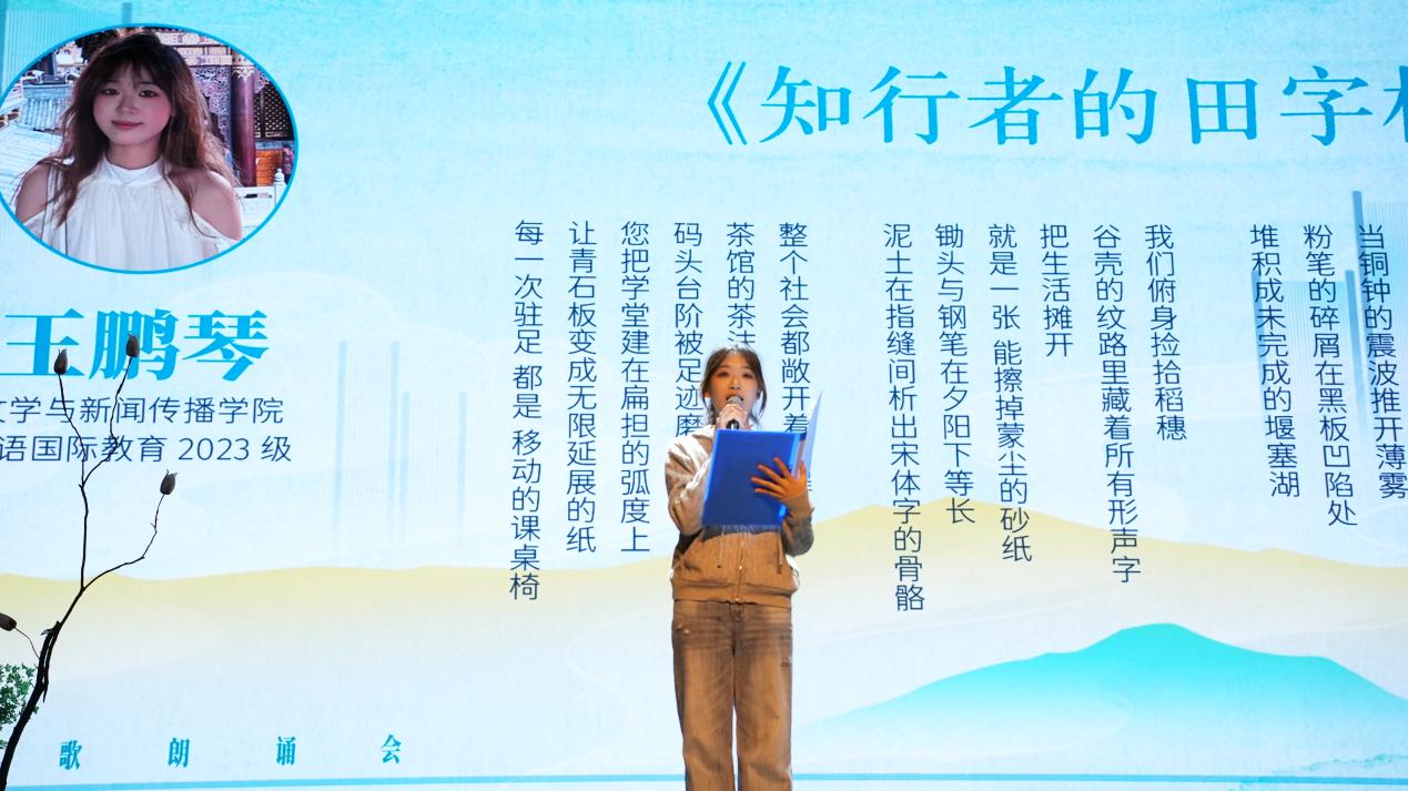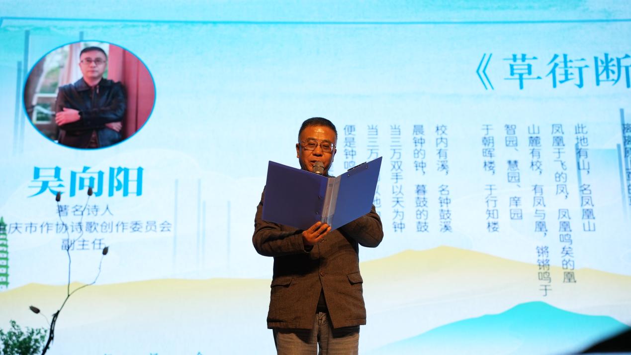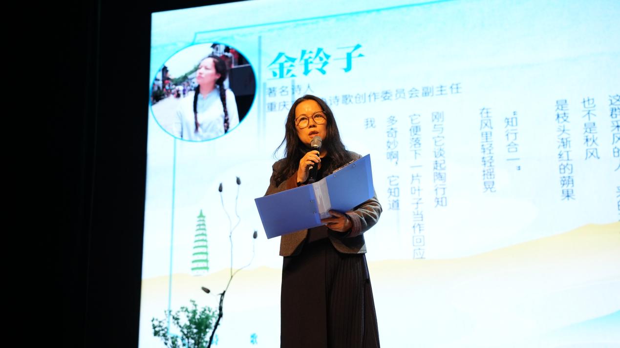 30首青春之诗 朗诵会在古典舞《折枝盼》的优美舞姿中拉开序幕,分为“让我再叫你一声先生”“青春森林里漫过书潮”“在草街,种下星光”“求知,行知”“春风吹醒读书天”五个篇章。 活动伊始,重庆人文科技学院校长周光明发表了热情洋溢的致辞。他代表学校,对远道而来的诗人、嘉宾以及全体师生表示热烈欢迎。他指出:“诗歌是无声的音乐,是有形的画卷,更是精神的火炬。今天登上舞台的每一篇作品,既有著名诗人、导师们的匠心之作,意境深远,底蕴深厚,也有青年学子们的青春吟唱,真挚动人,充满力量。”