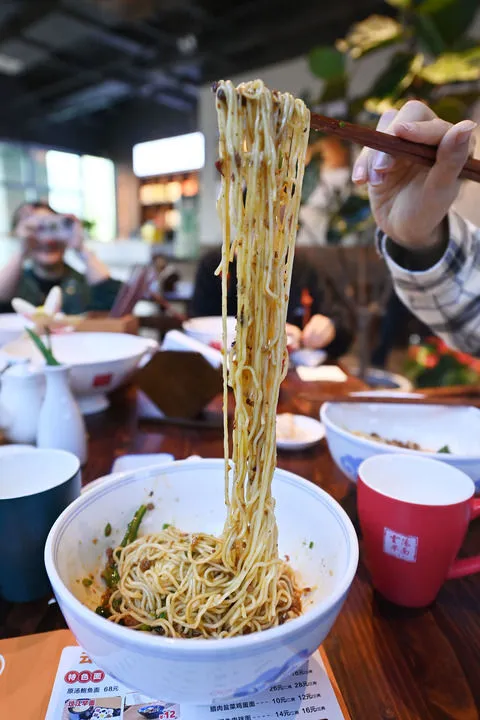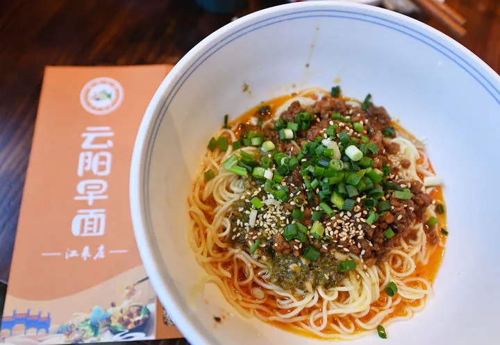 ▲这是11月4日在云阳早面餐厅拍摄的炸酱面。云阳早面是云阳县打造的面食品牌之一。新华社记者 肖潇 摄 不怕苦累讲诚信 一根面串起两个云阳县 云阳的历史有3000多年,西汉时期凿井取卤大规模制盐,是中国井盐的重要发祥地。盐业的繁荣让云阳成了南北客商的中转站。汉代起盐商带来北方的面食技艺,与当地的盐卤水碰撞,诞生了劲道耐煮的云阳碱水面。