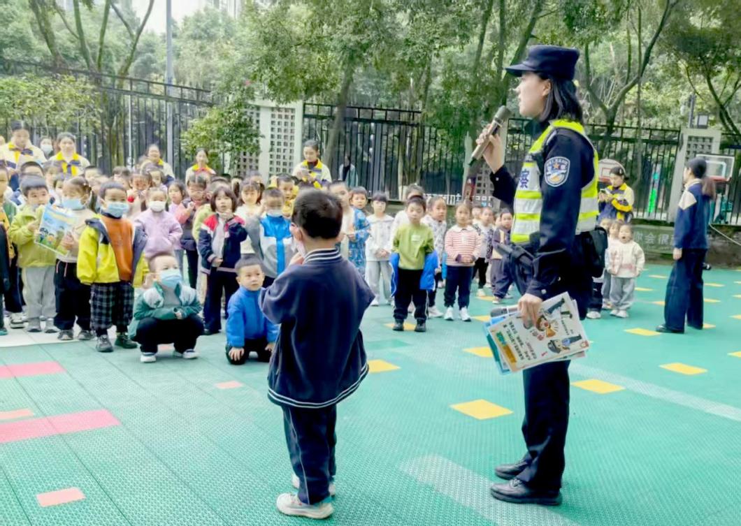 ▲民警开展宣传 同时,虎溪派出所民警封月在石牛岗社区某幼儿园开展防拐骗教育。面对由家长扮演的 “陌生人” 诱惑,孩子们用稚嫩却坚定的声音回应 “不”,并在民警引导下牢记 “找老师、记信息、敢求助” 的安全要点。