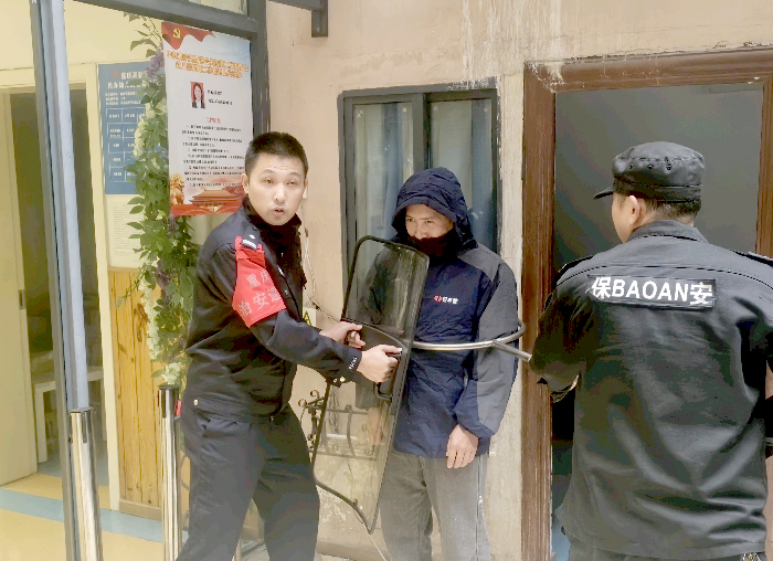 ▲开展安全疏散演练 随后,模拟 “不法人员” 试图闯入校园,学校安保人员手持盾牌、警棍等防护装备进行阻拦,社区民警组成最小作战单元迅速赶到,运用 “围、堵、封、控” 战术果断将 “不法人员” 制服,充分展现了快速响应和协同作战能力。