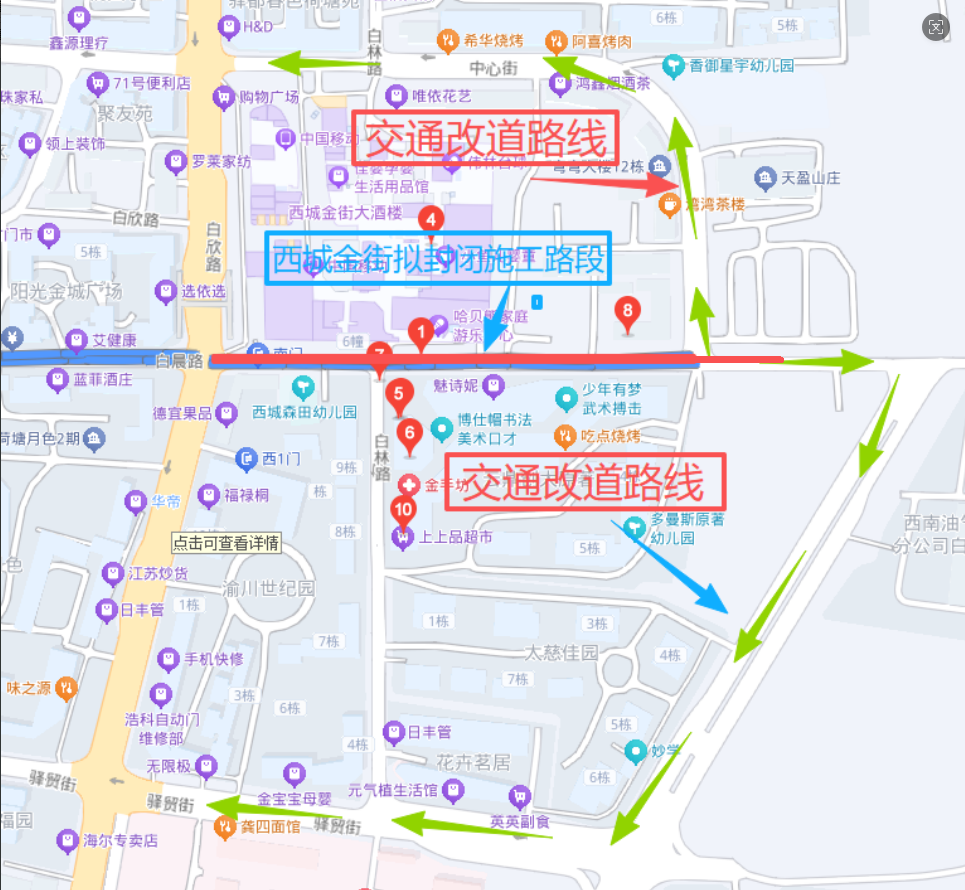 (区位示意图) 一、施工时间 2025年12月1日-2026年3月10日(全天24小时),共计100天。 二、封闭施工路段 白晨路(西城金街白欣路至白晨路北侧路段),占用总长度366m,宽度4m,将分三个阶段逐段封闭施工。 三、施工期间车行交通组织调整 原经白晨路(西城金街)→白欣路车辆改道经过白晨路(西城金街)→中心街(太慈路→驿贸街)→白欣路绕行。