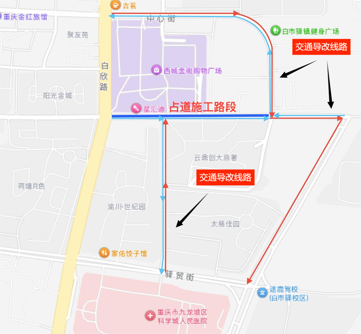 西部(重庆)科学城白市驿至含谷片区排水防涝设施建设工程西城金街路段新增管网位于高新区白市驿镇白欣路至白晨路,为了提升城市市政管网收集、排放能力,确保管网运行畅通,进一步改善居民居住、生活环境,提升城市品质,特占道施工新建雨水管网。 施工期间将分三个阶段施工,逐段封闭西城金街白晨路北侧路段,道路改为单向行驶(白欣路→白晨路)。原西城金街白晨路去往白欣路方向车辆绕行中心街或驿贸街至白欣路,白欣路去往白晨路方向线路不变,请广大市民朋友提前做好出行规划。现将有关事项提示如下: