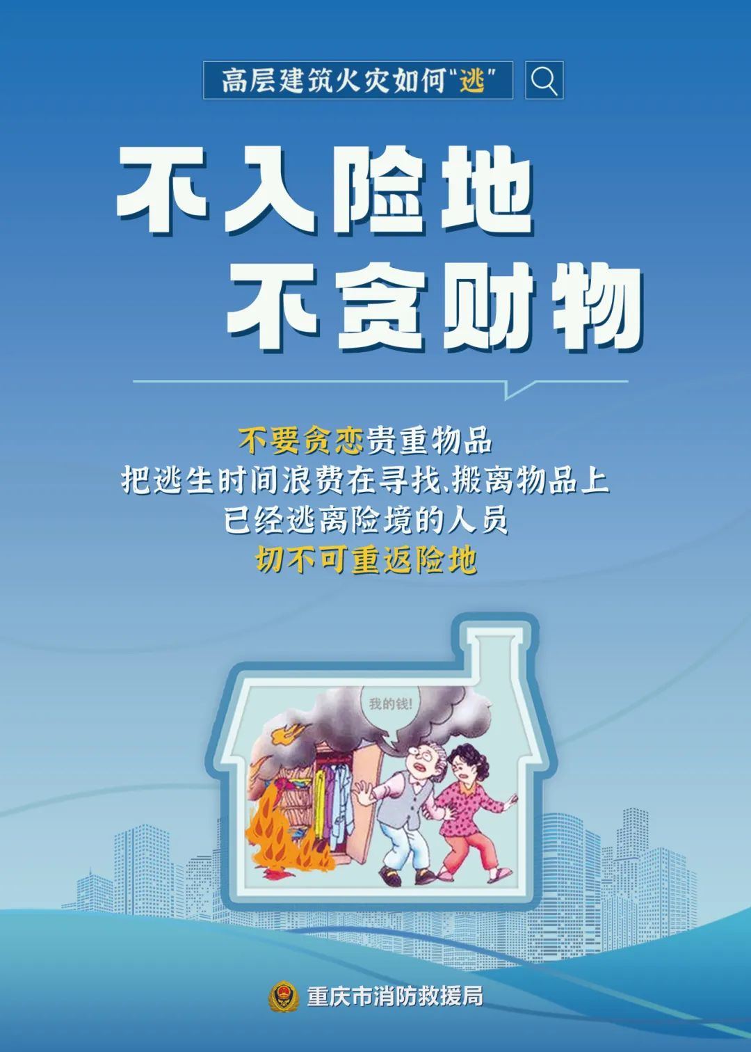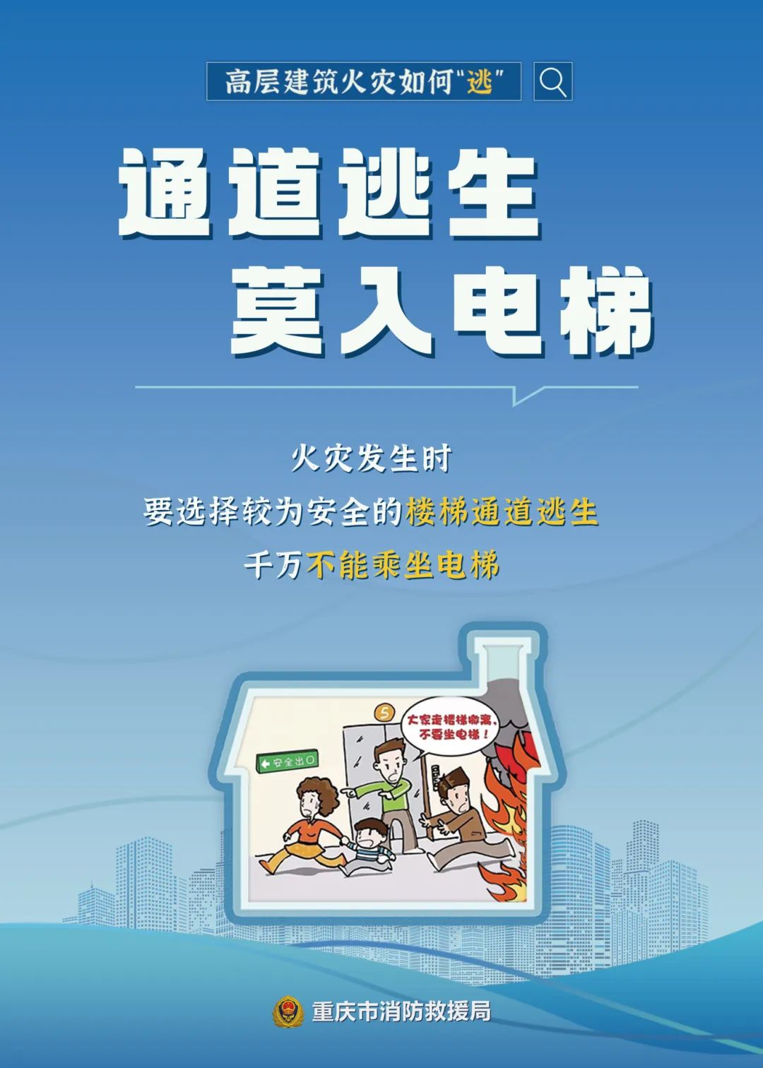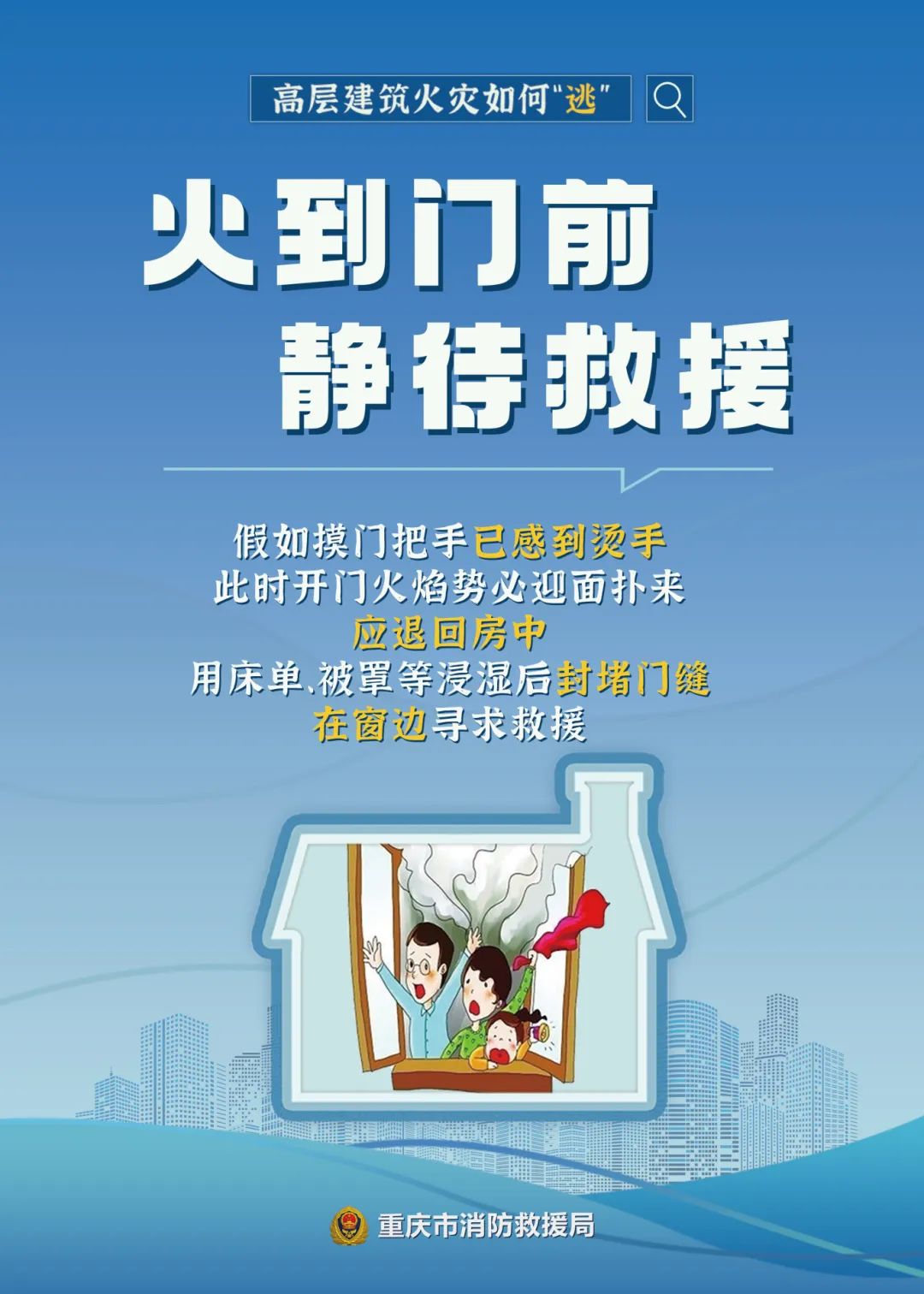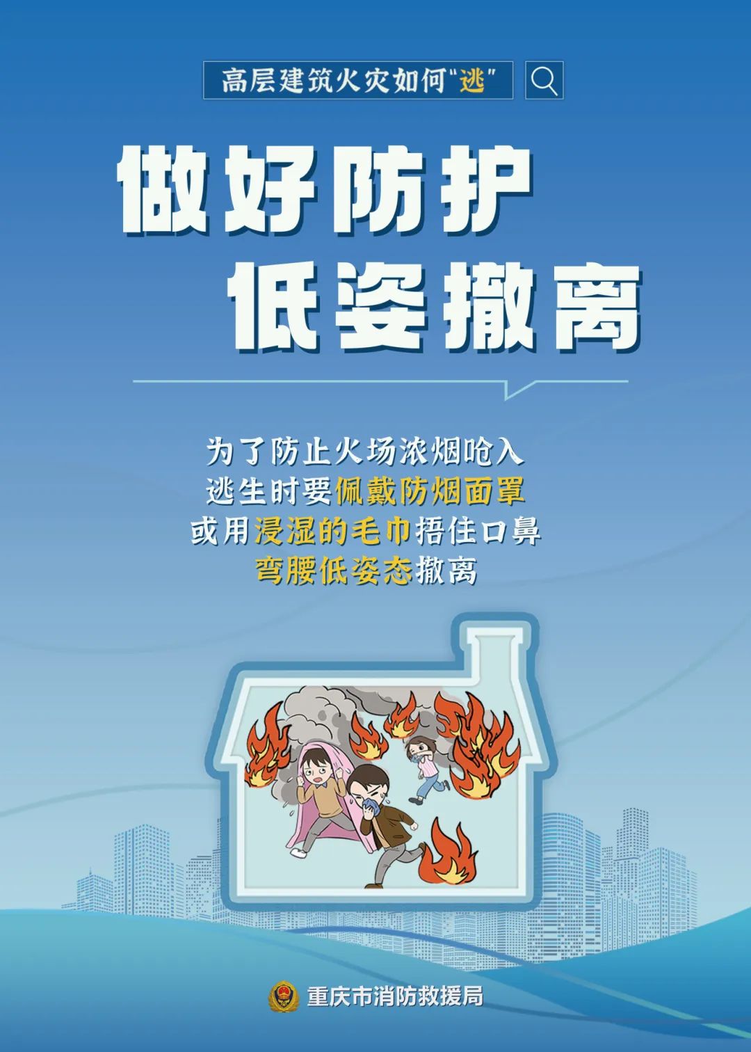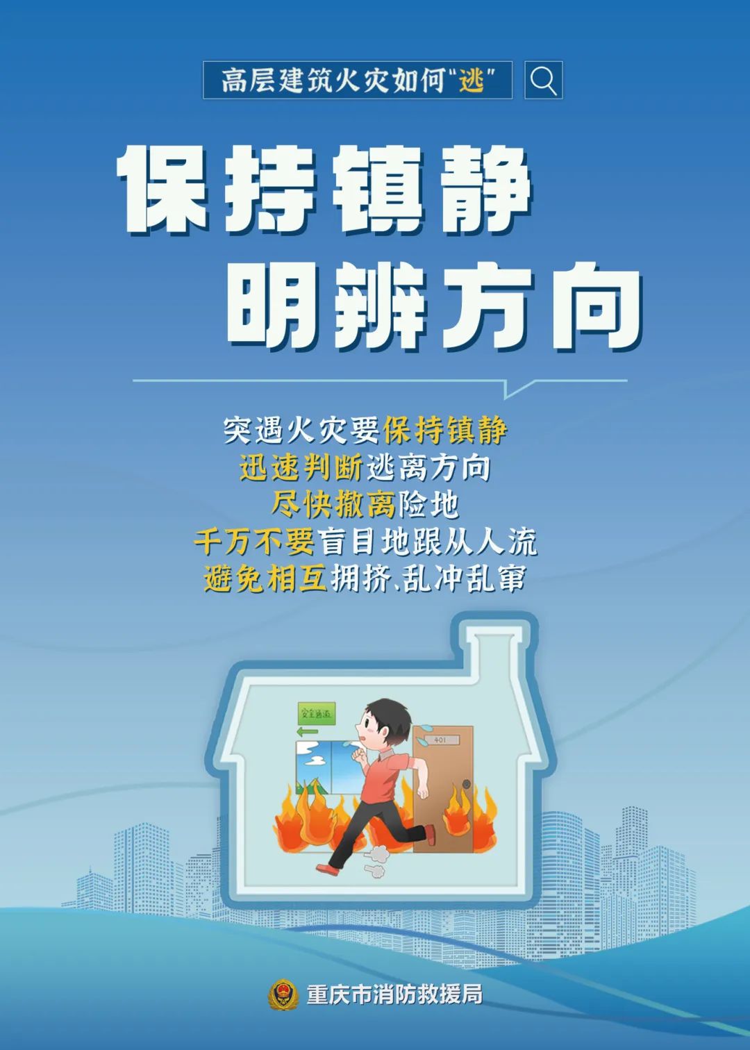 2022年12月1日,陕西省西安市未央区一高层小区发生火灾,部分居民冒险离家通过楼梯间、电梯向楼下逃生,但有的居民开门因楼梯间烟雾过大又返回室内,惊慌之下忘记关门挡烟,导致大量烟气涌入室内,造成5死3伤。 渝仔消妹提示 高层建筑体量庞大、功能复杂 人员密集、危险源多、火灾荷载大 一旦发生火灾 人员疏散和火灾扑救 存在较大难度 因此,高层安全逃生是一项必须掌握的技能 还要学会科学自救逃生