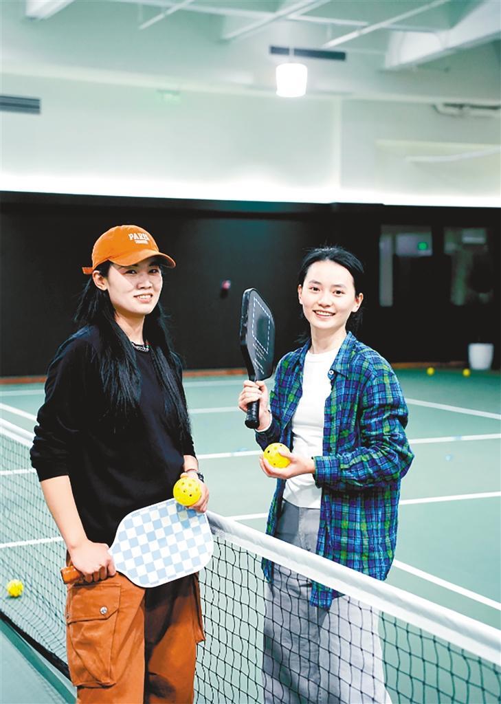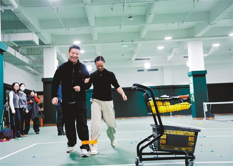 “两人三脚”合作运球 活动在轻松愉快的氛围中拉开序幕。青年们签到后随机组成五支小队,“双人运球接力赛”迅速点燃现场气氛——两人相邻脚踝被轻轻绑在一起,搭档们手托球拍、运送匹克球,有人步履一致顺利通关,有人球落重来,笑声不断。