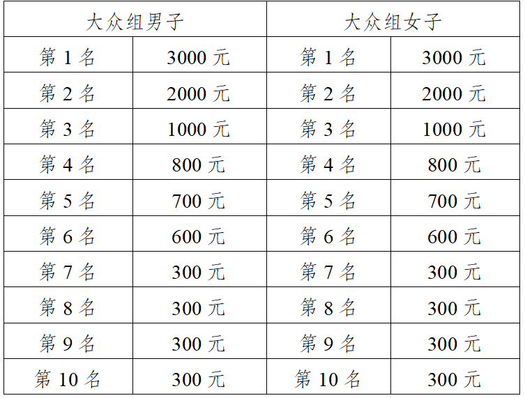 ▲长按识别二维码马上报名 大众组:58元/人 情侣组:109.9元/组 企业品牌组:458.8元/组 一经报名成功,不可更改参赛项目;若因参赛选手自身原因导致不能按时参加比赛,报名费将不予退还。 5.录取名次及奖励办法 (1)大众组个人奖 大众组成绩按净计时录取男、女前十名,为男、女前三名安排颁奖仪式。奖金见下表(单位:人民币/元)。