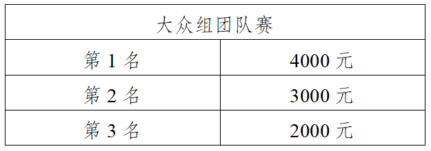 (2)大众组团队奖 组队为每个团队8人,取净成绩最好的4名男子选手、2名女子完赛成绩合作为团队成绩。按团队成绩录取前三名,如果对应名次团队运动员发现违规,取消团队名次,后面名次不递增。现场安排颁奖仪式,奖金见下表(单位:人民币/元)。