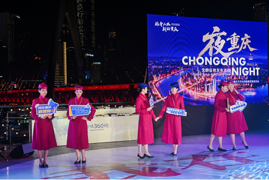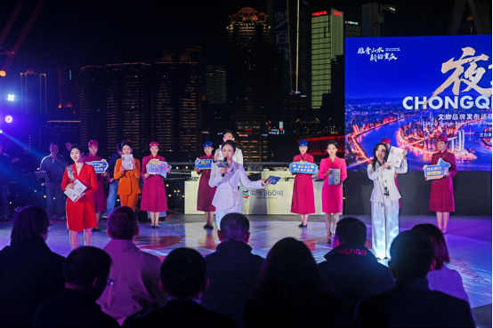 本次活动由重庆市文化和旅游发展委员会主办。重庆市文化旅游委及相关单位负责人、重庆十佳金牌导游、资深文旅推介官、媒体代表及游客代表等参加了发布活动。本次活动还通过视频号、Bridging News、Facebook、YouTube等海内外平台同步直播,邀全球游客共同见证“夜重庆”文旅品牌的发布。 实景为幕,“五夜”交响曲奏响山城夜魅力 “女士们先生们,我们的飞机即将抵达重庆江北国际机场。”在发布核心环节,重庆文旅推介官在“一城山水满城灯”的重庆实景中,以创意情景式演绎,带领现场嘉宾和全球观众开启畅游“夜重庆”沉浸式新体验。