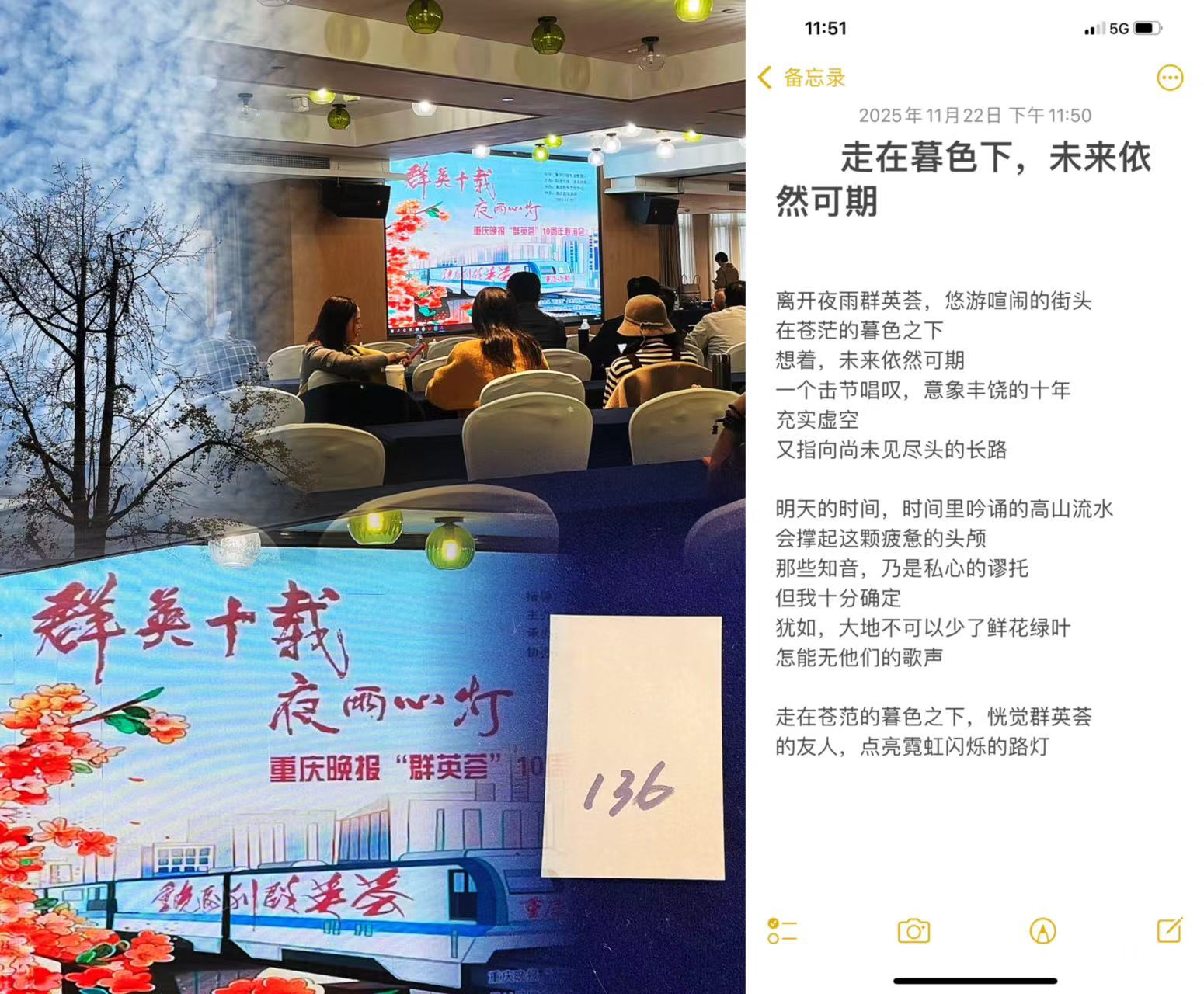 重庆晚报“群英荟”十周年联谊会于11月22日圆满举行 ,约150名群友欢聚一堂。大家意犹未尽,纷纷来文抒发友情。今天我们选发一组群友们的文章,感谢大家对重庆晚报“夜雨”副刊的不懈支持,让我们互致问候,重新出发! ——编者 重庆晚报“群英荟”十周年礼赞 耕夫 重庆直辖,文脉纵横。当融媒激浪之时,有星火燎原之势。乙未仲春,群英初会;乙巳盛景,十载同辉。五百人聚星汉文光,八千里涌巴山墨浪。此非寻常群聊,实乃文学铁军。 立群之本,在守正,在新变。昔时铅字飘香,今朝指尖传韵。晒稿会中,珠玉纷披银屏;采风路上,烟霞尽入锦囊。两江潮涌,曾照璧山夜月;武隆雾起,犹记垫江春耕。更跨蜀水黔山,西充问道,遵义寻根。双脚量山河,百城收笔底。此非虚拟世界,实乃真情道场。 公益讲堂,烛照乡野。十六校园留履痕,三千童子沐春风。文学讲师,化霖雨以润苗;夜雨群贤,秉烛光而传火。济人主席授真经,天琳大姐吟新篇。万俊举旗,广庆布道;大立挥毫,明凯抒怀;张者行吟,登科雅评。四届文学奖砥砺锋芒,多部作品集镌刻春秋。“秋风吹村庄”犹带稻香,“古老河道醒”尚涌涛声。 嗟乎!十年非长,然在融媒骤变之际,能守文学孤岛者几希?群英荟之可贵,不在规模,而在风骨;不在喧哗,而在深耕。当世浮光掠影,诸君偏作深潭;众人追新逐异,我辈独守初心。荧屏方寸间,存续千年文脉;晒稿切磋处,复活古贤遗风。 今朝盛会,既是回眸,更是启程。报业集团旌旗扬,轨道传媒鼓角震。看群英重整行装,以笔为舟,以心为帆,必将在新时代的激流中,再写华章! 赞曰: 十载风云荟群英, 巴山夜雨证深情。 荧屏寸幅涵今古, 笔墨千钧动帝京。 采得烟霞成锦绣, 浇开桃李竞欣荣。 从今更破沧溟浪, 直上青云续远征。 重晚副刊群英荟十年记 盛筱华 时维小雪,堂堂正正;集韵夜雨,潇潇洒洒。幸群友春光满怀,持之以恒。万俊星驰,十年依然。胜友人淡而雅,乃雅望之族;高朋气贤以精,竟懿范之君。岁至十周年,嘉瑞九龙坡。人文雅聚,盛典广庆;群英荟萃,温馨扬飞。不问收获,只问耕耘。春华秋实,欢天喜地。 曾记否,二〇一六年中秋,周岁之前,秋韵齐园。吴丹待嘉宾,群贤写真了人舍。品书鉴字,听琴读画。鼓瑟吹笙,握月担风,花好月圆!赏卢德龙、常克、汪国强等之书画,听王明凯、蒋登科等之诗歌,轻吟耕夫即兴诗句:诗怀淡处吟秋色,文王闲时赋落花。黄济人曰:雅聚干净似明月,轻松;傅天琳指:好评诗文有滋味,舒服。知恩乃人中俊杰,感恩乃文学旋律。忠言贤论,共济和衷。政事文学,才艺交通。又闻满座撰述,道乾坤日月两珠,魂牵诗文芳径;观草隶精工,点天地烟云一笔,墨香书画宏图。 十年,群友笔耕不辍,风景入画,诗书人生。虽情随景迁,而惑由心昧。解惑不昧,互尊师友。人生欲精彩必重友,果实欲成熟需待秋。十载,岂一时禅机妙理叠放,人生感悟振荡。此诗书画者,彼定慧戒也。画地为牢之,不如无非分之,心地无非自性戒;书不释手之,不如无痴狂之,心地无痴自性慧;诗情画意之,不如无心乱之,心地无乱自性定。仰观宇宙,人生至春秋鼎盛时,一叶知秋为师;俯察品类,万物过春兰秋菊季,秀色可分为友。文以载道,群以聚精。尊师文学人学,重友文化文明。服务交流,分享提高。宽容相贵,永恒情真。 儒雅原本文化,夜雨驾雾腾云;时光果不负约,欢乐如期而至。今日相庆,十年人文。诗景书观,妙笔花飞。言志之诗舒爽,经世之理气壮。爱家国鞠躬尽瘁,颂河山堂构辉联。个个民心满怀,人人民生可敬。才气横秋,一字千秋,各有千秋,更独有千秋。群英十岁,华章五部。萦绕亲切的声音、回首难忘的岁月、漫天发光的花絮、增强闪耀的记忆、标致欢乐的群英。口琴笛奏独唱脱口秀,诗歌舞蹈小品古筝弹。一曲新歌,十年成钢。音词天籁,继往开来。线上赛稿点燃文思跌宕,踏浪采风步韵叠作诗行。美健非力,幽默乐羊子,劲松乃正!雅俗不常克。寄语,高瞻远瞩,高屋建瓴;感怀,养心养智,益弟益哥。 今聚虽非胜地,又无曲水流觞,也无一色海天,但依然热情畅叙。况浮云上青天日居月诸,心海里晚报初心不忘。观节目,养天真。如聆听箴言,观赏大作,仿佛与天地对话,与乾坤合唱,与日月舒情。有幸躬逢其盛,自慎不可独享殊胜,拙记来,夜雨十年灯,成功再启航。文字相守,下个十年,燕燕于飞。天之苍苍,以壮行色。 十年,我们再相会 张艺 与《重庆晚报》的相遇,是在读书的时候。 清晨,打开报箱,记得酸奶与报纸总是差不多时间到,而晨间的曼妙莫过于一边吸着天友酸奶,一边沉浸在纸墨馨香里。我不明白为什么报纸不是晩上送到,而是早上就到了,有一次终于和送报人正面碰上了,他说只负责送,不负责印刷,就转身去投递下一家。那时的报纸差不多有三十多个版面,厚厚一叠,很多信息都能从上面获得,它是我读书生活不可缺的一部分。 文字帮我们倾诉内心的东西,有时治愈,有时释怀,有时也让我的虚荣心得到满足。读中学时,年级主任手臂夹着一份报纸在上英语课时走进了教室,班主任在他拿来的本子上签了字后就让全班起立为我鼓掌,笑得比我还开心,原来我的一篇文章登上了报纸,下课后,我又被叫进了语文办公室,语文老师送我了一支镶金边的墨绿色签字笔,自动的。他在其他语文老师面前表扬我,又笑着批评我说人物心理活动应该抓住细节,你还可以写得更生动。 在语文组老师们赞扬的目光下,我按捺