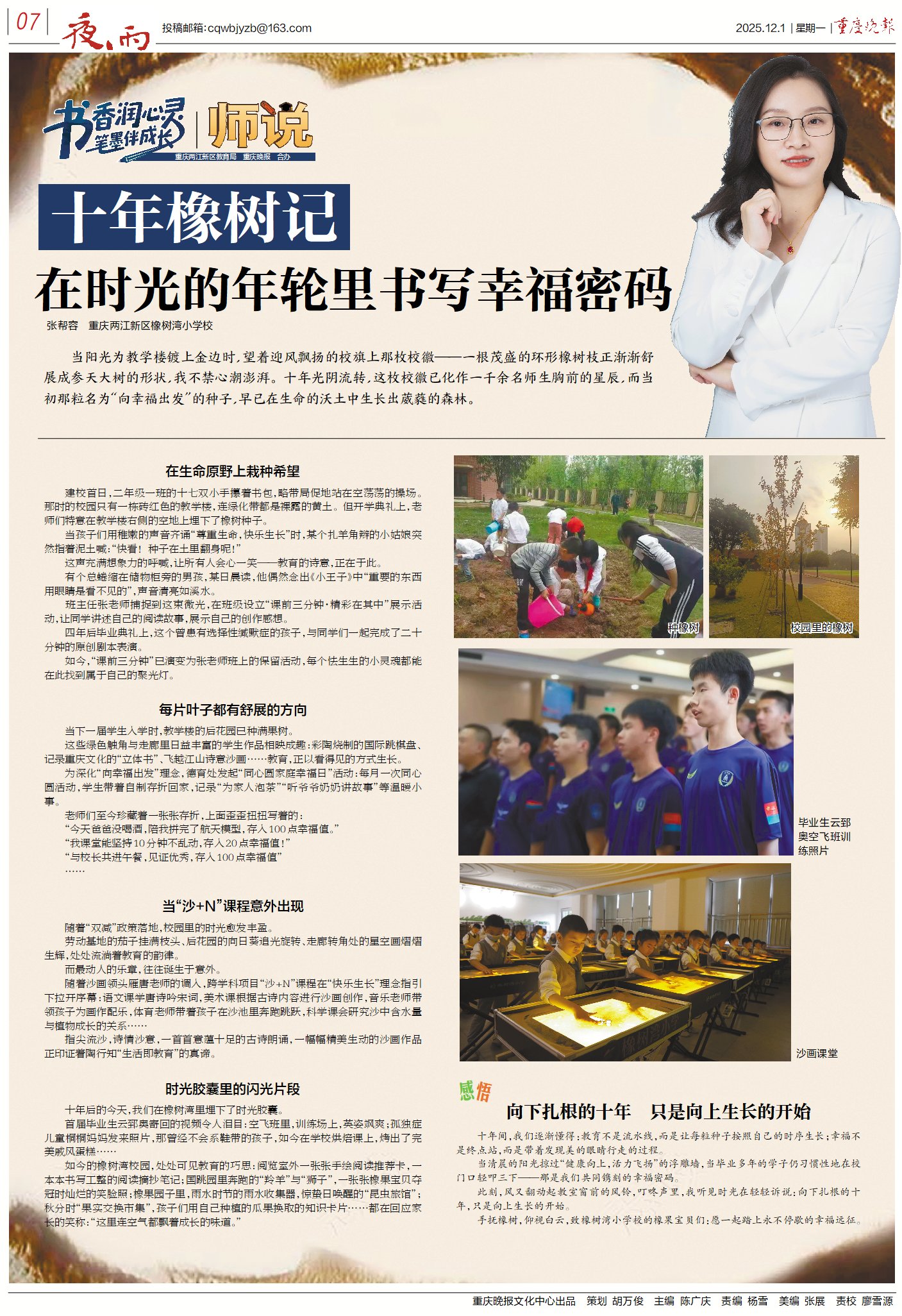 书香赓续,薪火相传;笔墨不息,步履铿锵。由重庆两江新区教育局与重庆晚报联合打造的“书香润心灵 笔墨伴成长”——《少年说》与《师说》双专栏,满载第十期的温暖与力量,如期迎来第十一期的相遇。我们依旧以文字为媒、以教育为魂,与您再赴一场温柔而坚定的成长之约。 本期《少年说》,依旧闪耀着两江少年的澄澈与担当。他们或以文字记录校园里老师的温柔和阅读的微光,或以思考探寻未来人生的航向,或以敬意礼赞平凡中的不凡力量。每一段文字都镌刻着青春的印记,每一份表达都彰显着少年的初心。 《师说》专栏则继续书写教育者的坚守与温情。我们将一同聆听老师们在三尺讲台的育人故事,感受老师们用耐心与智慧点亮学生心灵,用坚守与热爱护航成长之路,解锁师生同行、教学相长的教育密码。 重庆两江新区教育局与重庆晚报,始终坚守初心、深耕教育,用心搭建交流桥梁,用情传递教育温度。愿本期专栏让您再次触摸到两江教育的厚度与暖意,见证少年向阳生长、师者润物无声的动人图景,共绘立德树人的美好篇章。 十年橡树记在时光的年轮里书写幸福密码张帮容 重庆两江新区橡树湾小学校