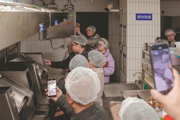 各社区食堂负责人齐聚民主村 下午2:30,在民主村社区食堂负责人李恒的引导下,与会负责人深入前厅与后厨,实地探访其运营细节。前厅里,自助餐区与特色档口相补充的布局,体现出对多元客群需求的精准回应;后厨中,智能烹饪机器人全程作业,配合标准化净菜加工与供应链管理系统,展现出高效、透明的食安管控流程。“从选菜到出品,全程可追溯,还有效节约人力成本,这确实是智慧的赋能。”参观过程中,不少负责人围绕智能设备投入、运维成本与长期效益等问题,与李恒展开热烈交流。