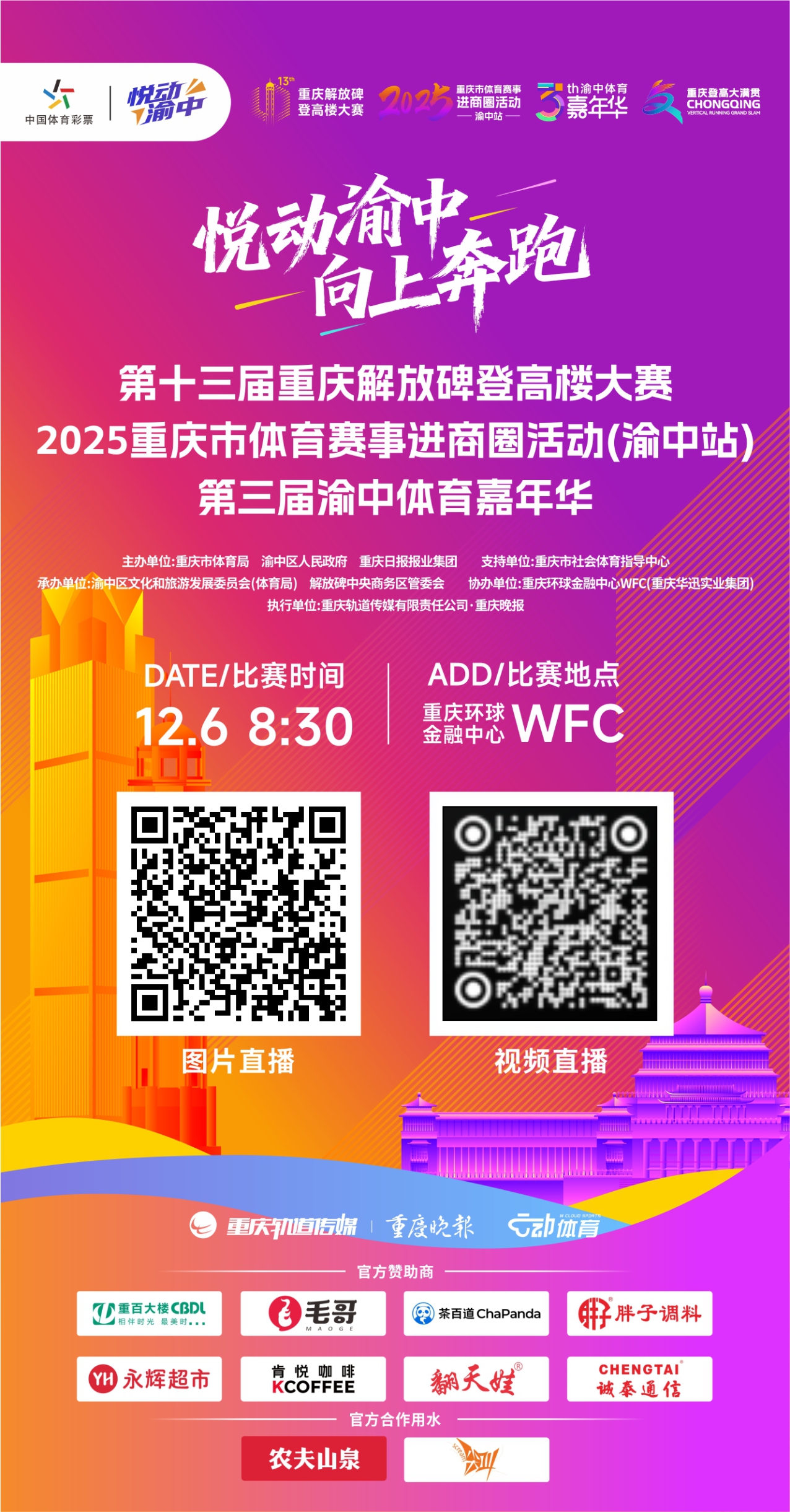12月6日上午8:00直播提前暖场,8:30解放碑下发令枪响! 近千名勇士向着339米WFC“重庆之巅”冲刺 这场延续十三载的山城热血赛事,邀你云端围观! 保存这张图,点击“预约”按钮 开播第一时间提醒,不错过任何一个燃情瞬间!