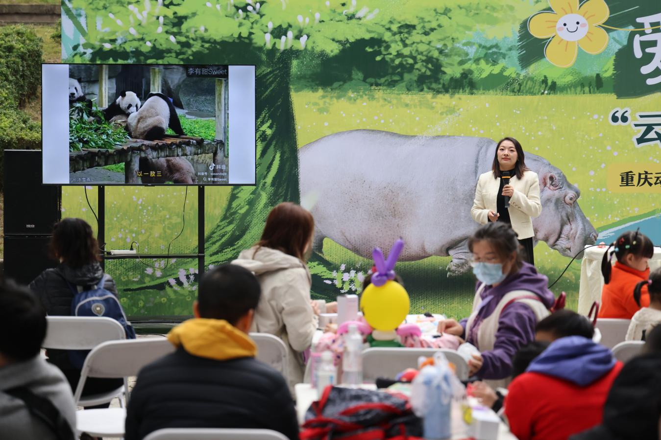 重庆动物园科普老师田小芳为大家科普大熊猫知识 活动中,重庆动物园科普老师与资深保育员打造的沉浸式科普行走课堂,内容涵盖珍稀物种的习性知识,动物保护的核心意义与科学方法,以及亲子日常参与保护的实用路径,与孩子们一同参观途中穿插趣味问答互动,鼓励孩子主动提问、积极交流,让科普教育更具互动性与记忆点。 孩子们还探访动物专属馆区,实地观察动物的自然行为,深入了解物种的生活习性、当前保育现状及认养支持带来的实际成效,让动物保护的价值直观可见、真切可感。
