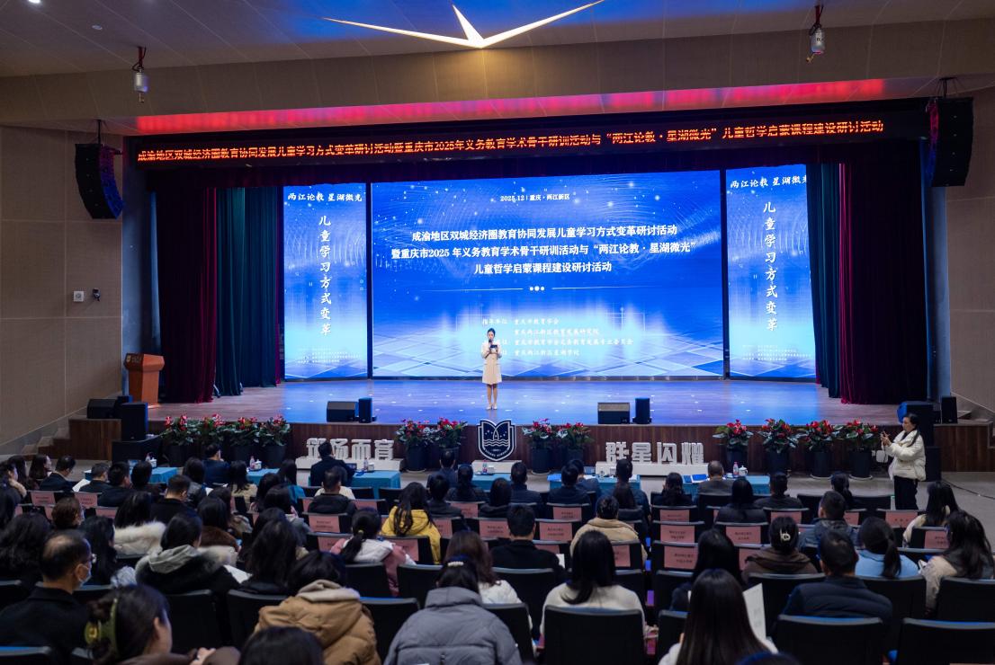 12月12日,成渝地区双城经济圈教育协同发展儿童学习方式变革研讨活动暨重庆市2025年义务教育学术骨干研训会在两江新区星湖学校举行。本次“两江论教·星湖微光”研讨会聚焦人工智能背景下儿童哲学启蒙课程的构建与学习方式转型。活动由重庆市教育学会义务教育发展专委会常务副理事长、两江新区教育局德体卫艺组副组长刘红梅主持。 活动在儿童哲学主题音乐剧《答案之外》中启幕,通过艺术形式生动呈现“学习如何在追问中发生”。开幕式上,星湖学校党支部副书记张俊与成都王府外国语学校党支部书记、校长管小波分别致辞,共同表达了推动儿童哲学课程共建、促进成渝教育协同发展的意愿。 两江新区教育发展研究院院长曾万学在讲话中强调,面对人工智能时代的教育新挑战,必须通过课程与教学创新,着力培养学生的批判性思维、价值判断能力和终身学习素养。 活动现场 学校供图 在专题报告环节,三位专家从不同维度深入阐释了儿童哲学与学习变革的内涵。原重庆市社会科学界联合会副主席潘勇在《从娃娃开始学哲学用哲学》报告中提出,哲学启蒙应立足儿童的真实生活与直接经验,让提问成为学习的引擎。 西南大学教育学部教授张良在《如何理解学习——学习科学下学习的新理解》中,系统解析了学习的内在机制,为课堂从“教”向“学”转型提供了理论依据。 星湖学校校长张先彬结合校本实践,作了《人工智能时代儿童哲学启蒙教育的价值重构与实践路径》报告,强调在技术高速发展的当下,更应通过哲学教育守护儿童的价值判断、意义建构与情感联结能力。 下午的示范课环节,三节课分别从数学、语文等学科展现哲学思辨与日常教学的融合。星湖学校黄毅老师执教《无以规矩 不成方圆》,在数学课堂中渗透规则与自由的辩证思考;成都王府外国语学校邓小林老师通过《牛和鹅》引导学生探讨“强弱”“尊严”与多元视角;重庆大学城人民小学江丽丽老师借助《“精彩极了”和“糟糕透了”》,在情感教育中融入成长哲学。