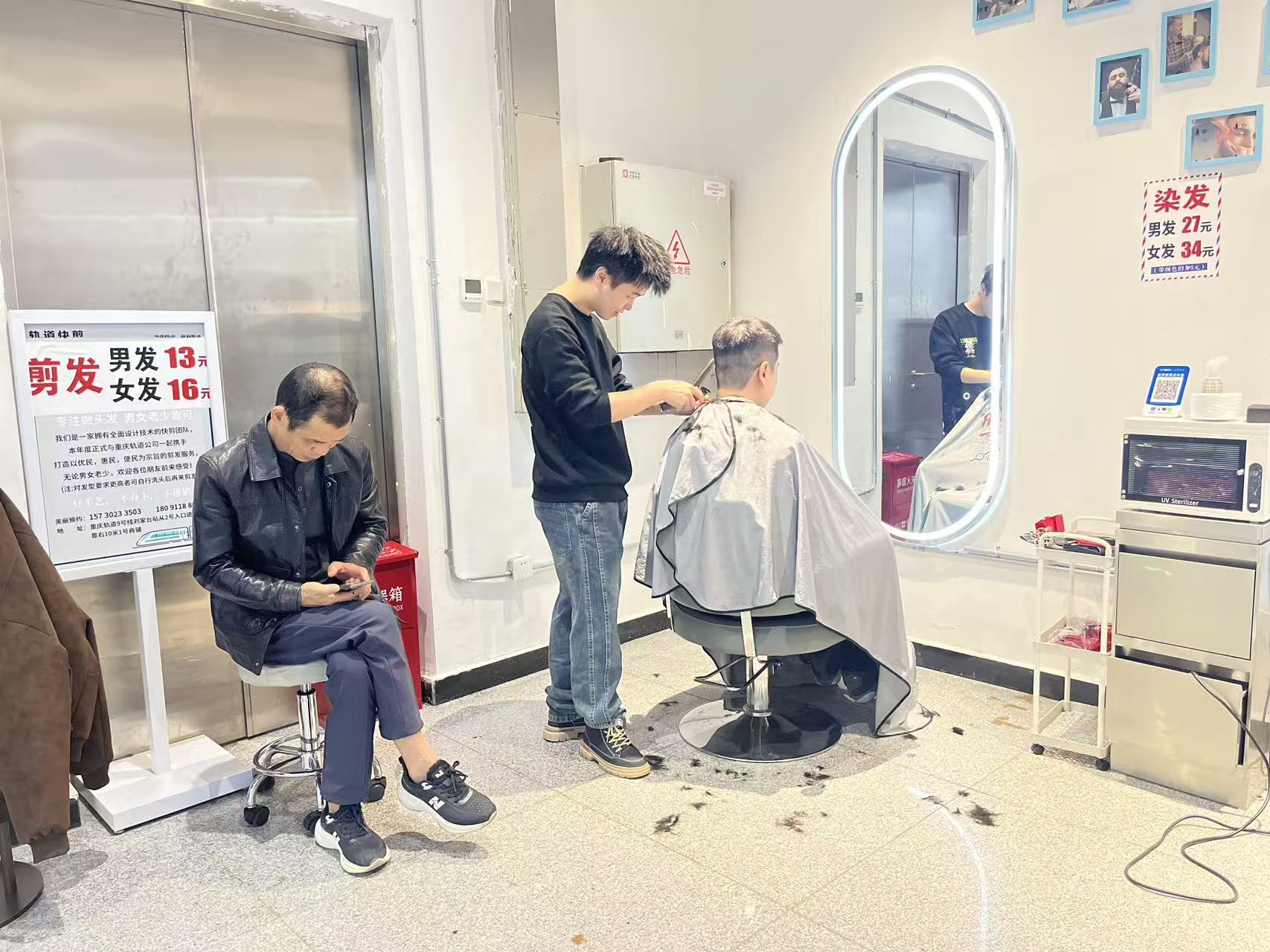 约20平方米的店铺整洁明亮,“快”是这里的特色。不洗头、专注修剪,全程基本控制在10分钟内。理发师何先生手法娴熟,剪完后用吹风机和海绵仔细清理顾客颈部的碎发,“考虑到乘客赶时间,我们还准备了湿纸巾,方便他们在路上自行整理。”