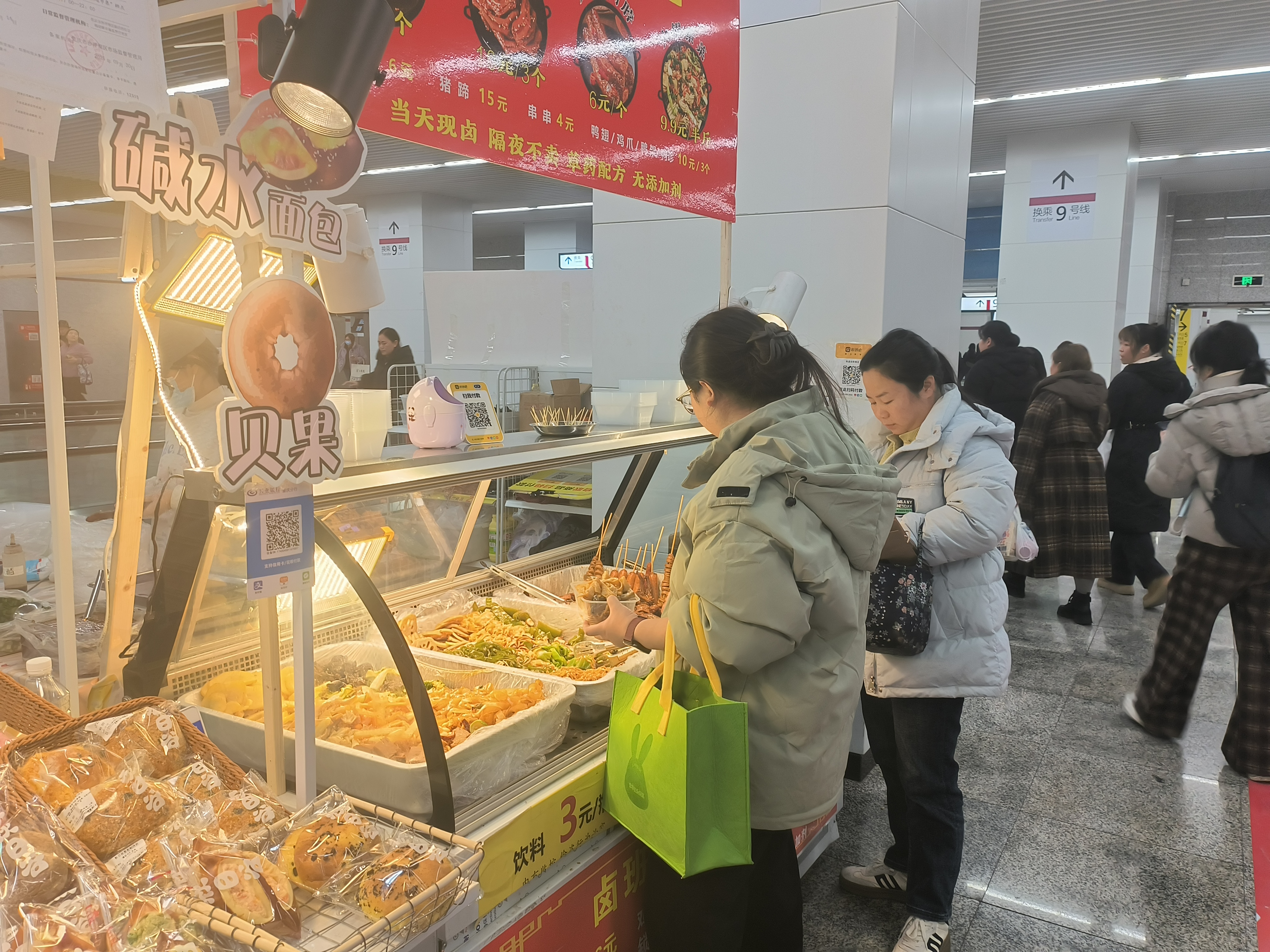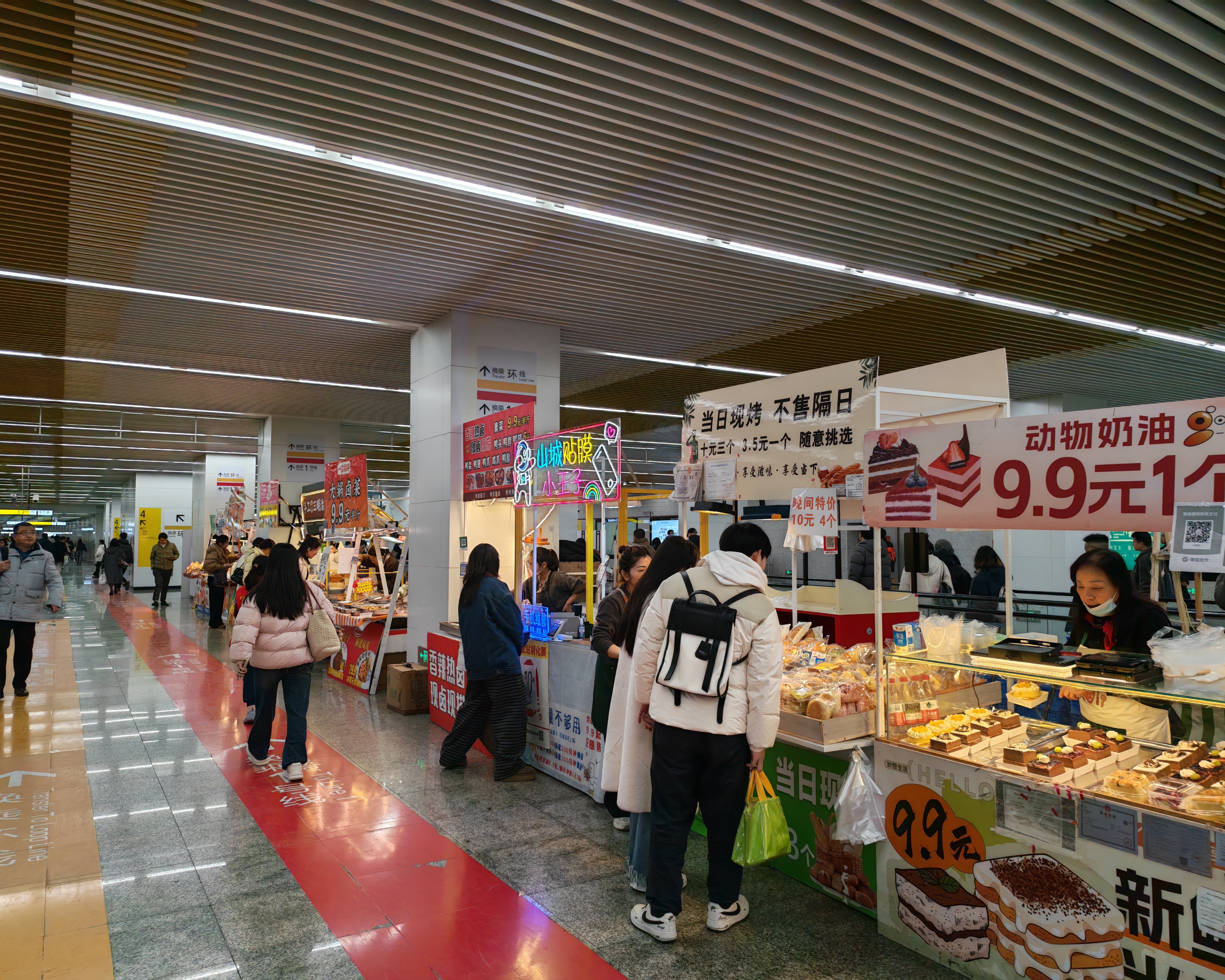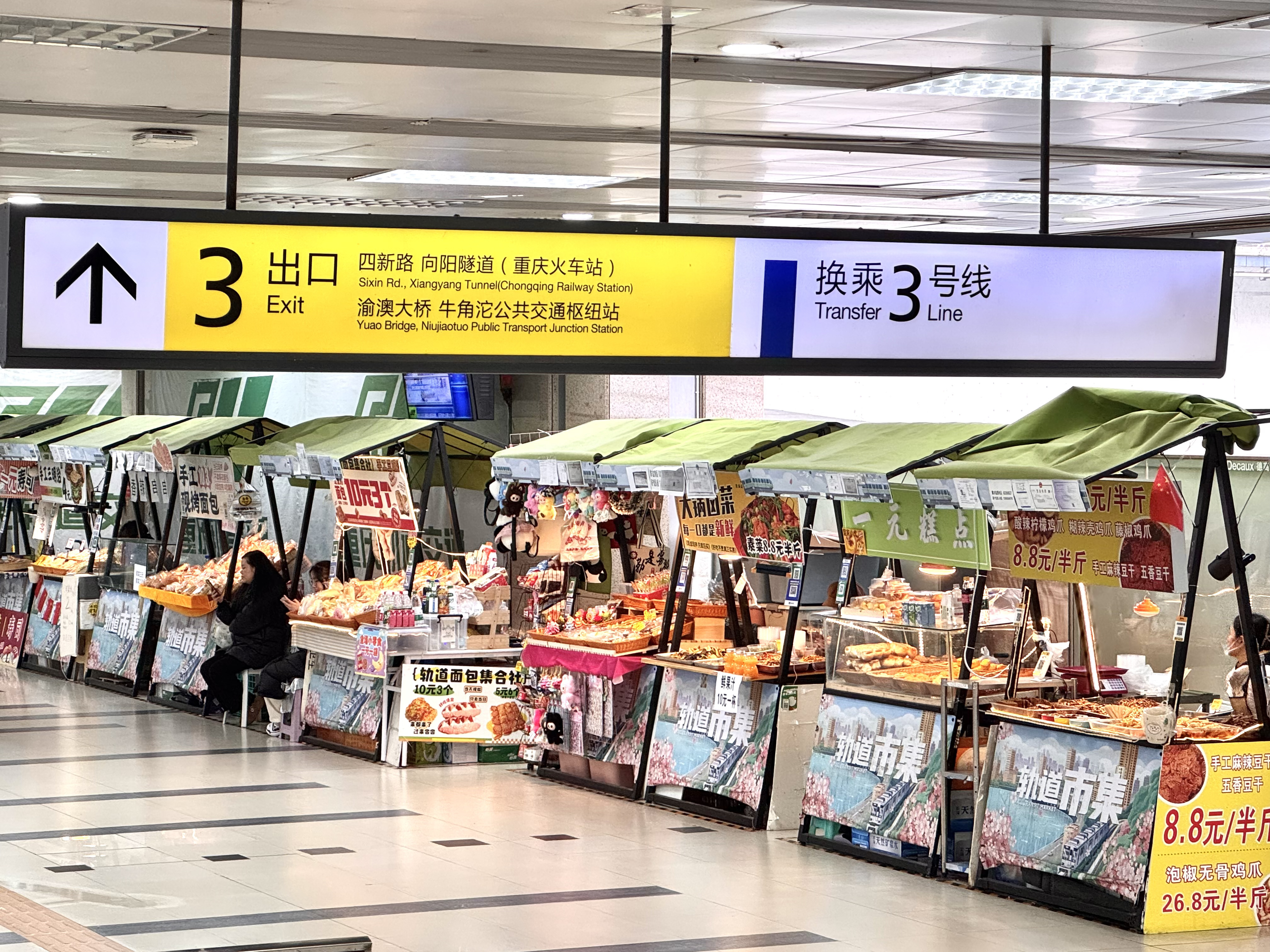 对经营者而言,这里不仅是生计所在,更创造了灵活就业的机会。售卖面包的唐先生日销售额可达千元;卖酸辣柠檬鸡爪的刘女士坦言:“人流量大确实提升了销量。” 重庆北站、南广场站:应急又暖心的方形港湾 18:30,10号线与3号线交汇的重庆北站南广场站,8个市集摊位在换乘通道中央围成一个温暖的长方形。琳琅满目的商品在繁忙的交通枢纽中,开辟出一片充满生活气息的港湾。