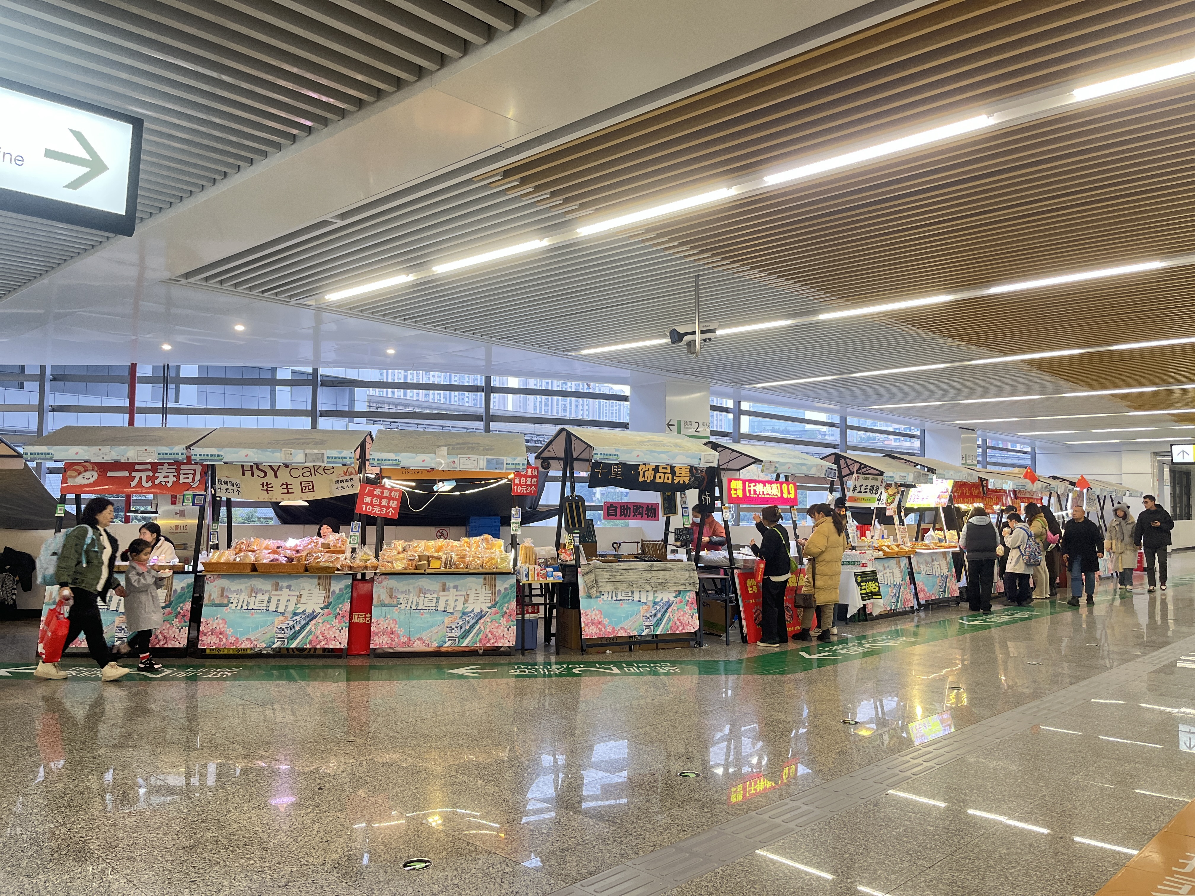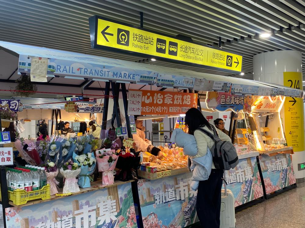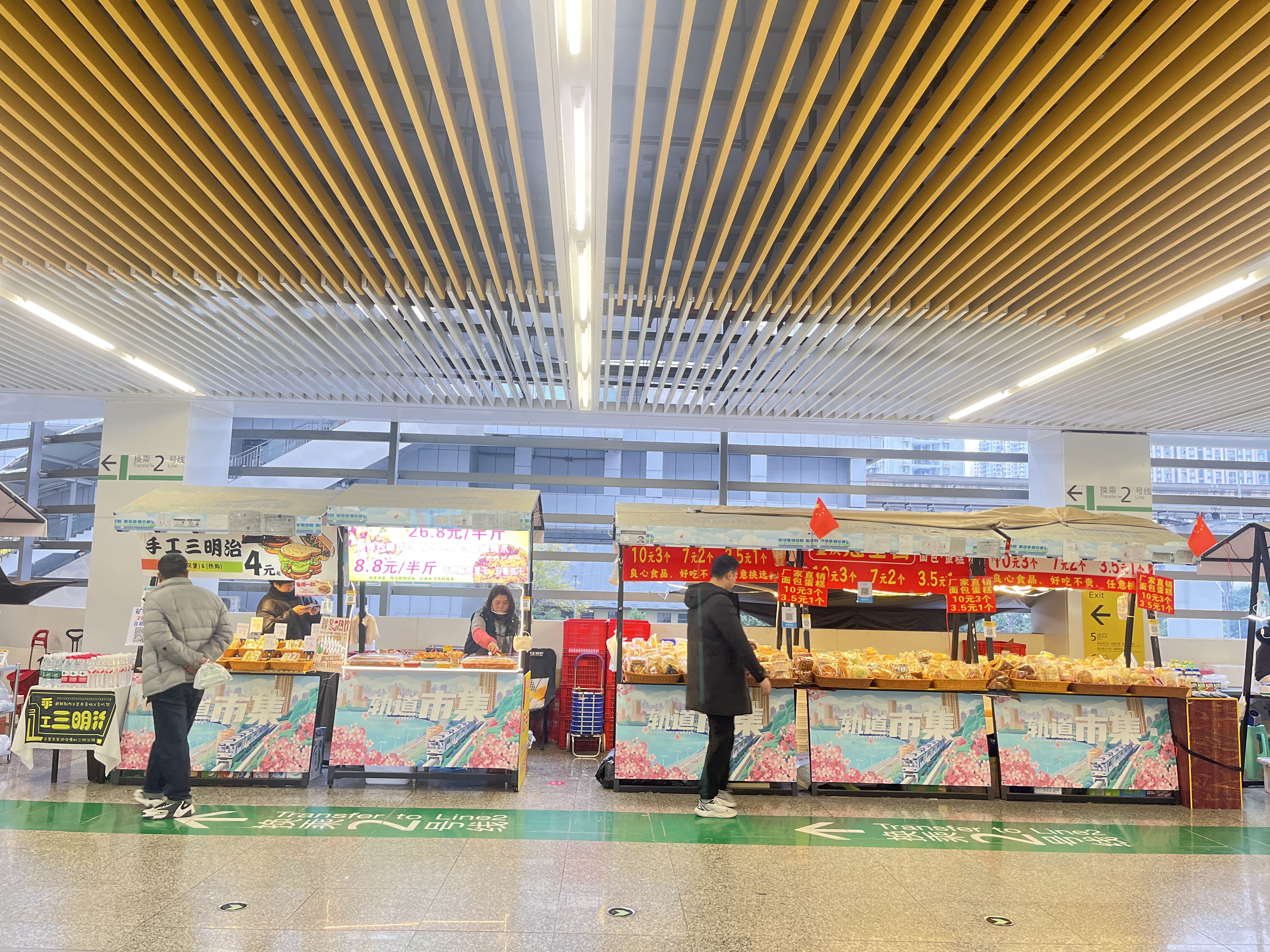 对经营者而言,这里不仅是生计所在,更创造了灵活就业的机会。售卖面包的唐先生日销售额可达千元;卖酸辣柠檬鸡爪的刘女士坦言:“人流量大确实提升了销量。” 重庆北站、南广场站:应急又暖心的方形港湾 18:30,10号线与3号线交汇的重庆北站南广场站,8个市集摊位在换乘通道中央围成一个温暖的长方形。琳琅满目的商品在繁忙的交通枢纽中,开辟出一片充满生活气息的港湾。