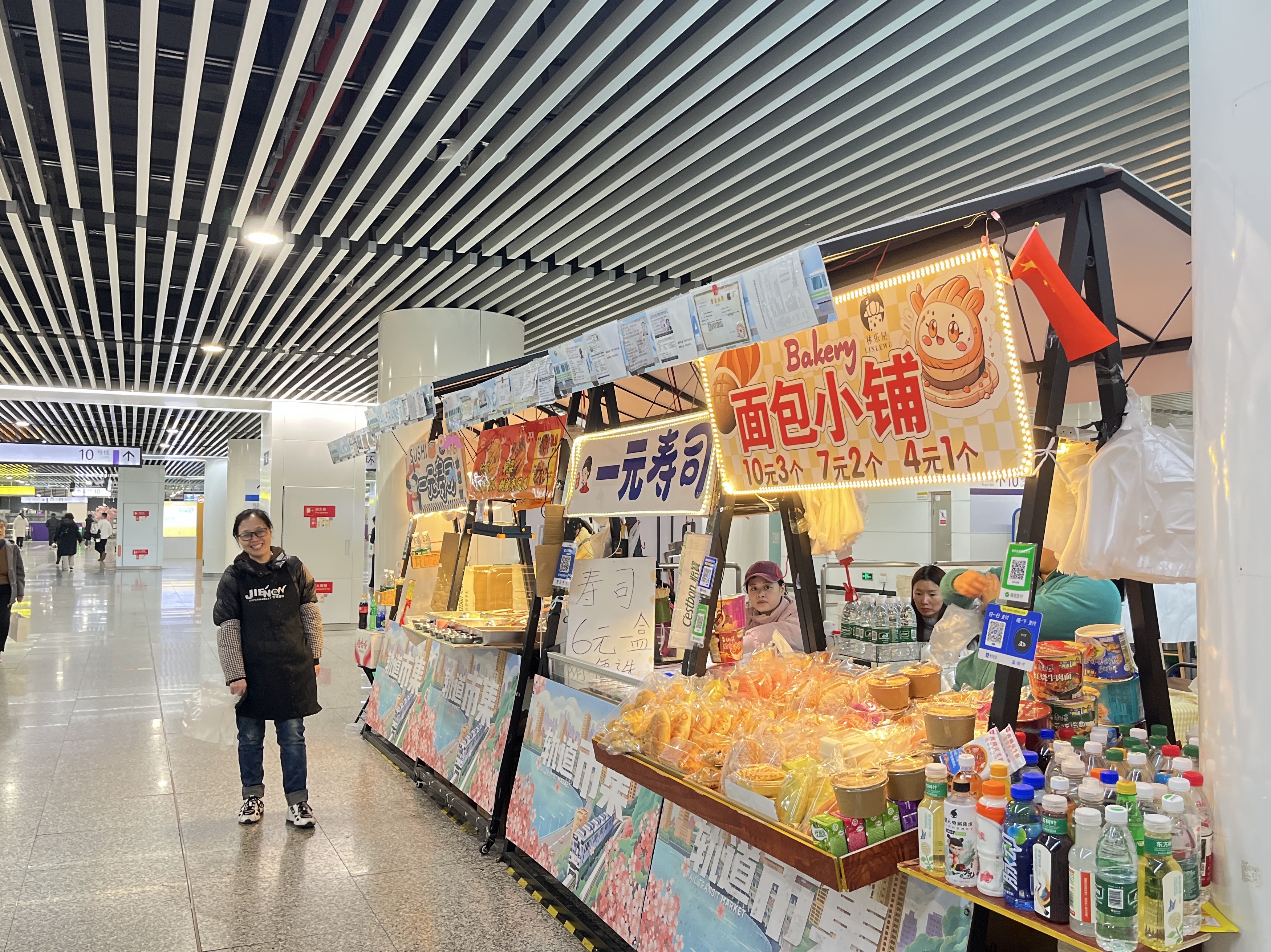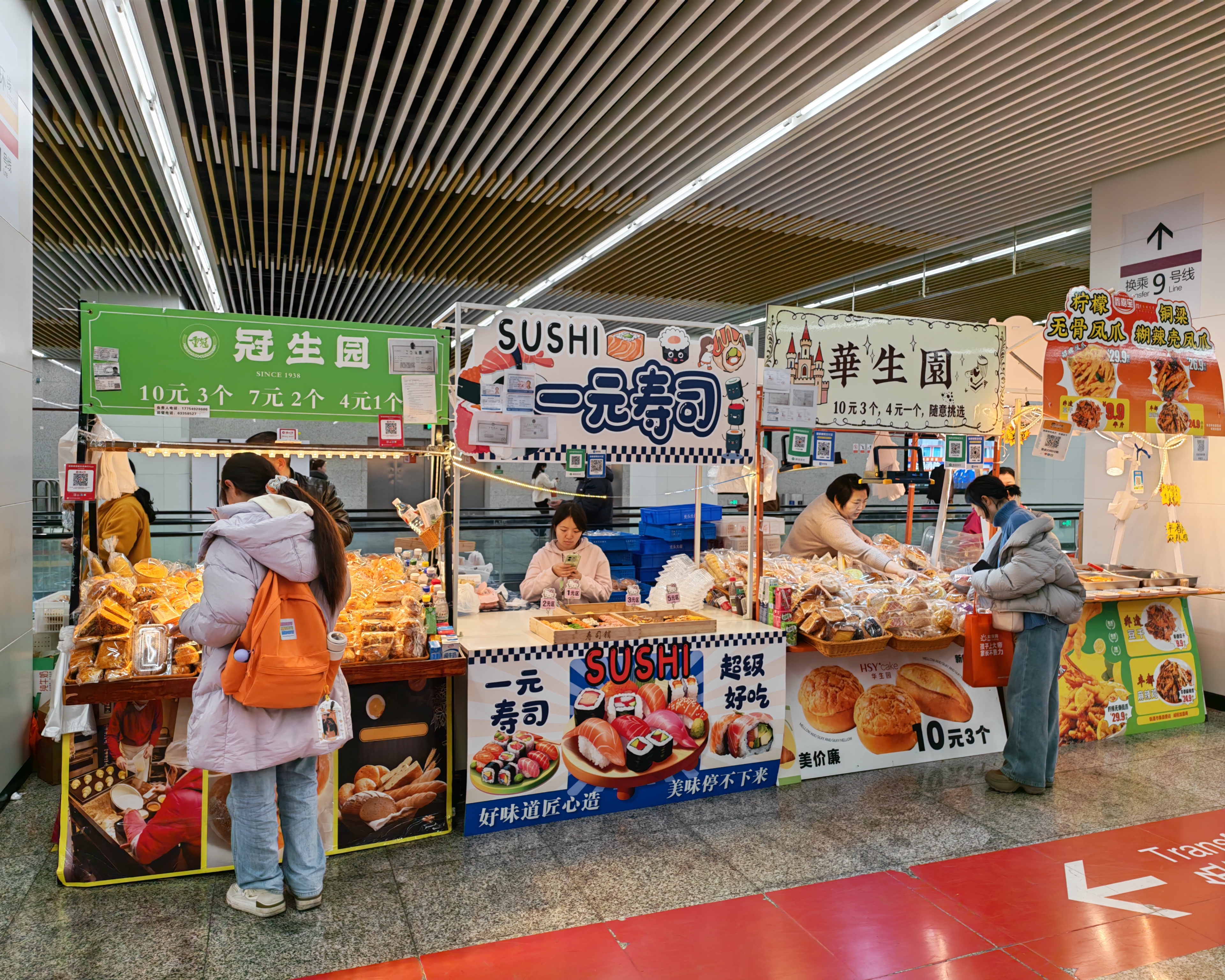 乘客王先生首次在此购物:“明早要出游,正好路过带点吃的,很方便。”张女士则说:“下班饿了时,看到轨道站里还有面包卖,觉得特别安心。这些摊位真的很应急。”而乘客刘女士已是本周第二次来买寿司给孩子当早餐:“对赶时间的家长来说特别方便。”