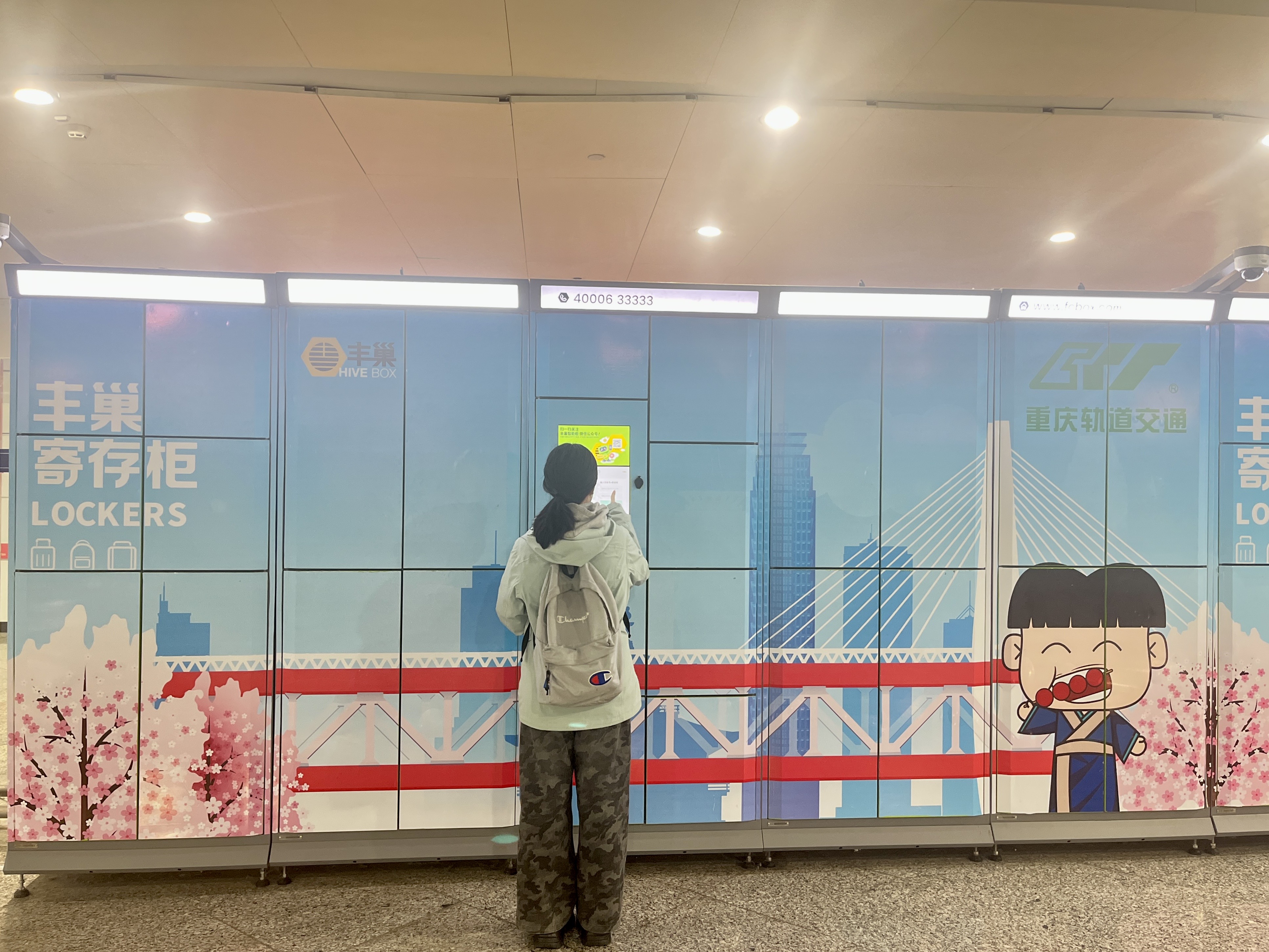 紧邻的潮流玩偶摊则是年轻人的心头好,卡通角色、手工摆件吸引着许多年轻乘客和学生。刚买了一个卡通玩偶的李女士说:“等车时逛一逛,看到孩子喜欢的就带一个走,算是给孩子的小奖励。” 旁边的小零食摊品类繁多,从独立包装的坚果、肉脯到怀旧的糖果饼干,满足着人们即时的口腹之欲,也抚慰着一整天的疲惫。 便民服务站:“存寄取憩”一站式解决 从重庆北站南广场7号出入口出来,三个蓝调点缀樱花与卡通图案的丰巢寄存柜格外醒目。这里采用扫码寄存,按柜型大小和时间收费,服务时间从清晨6:30至深夜23:40。