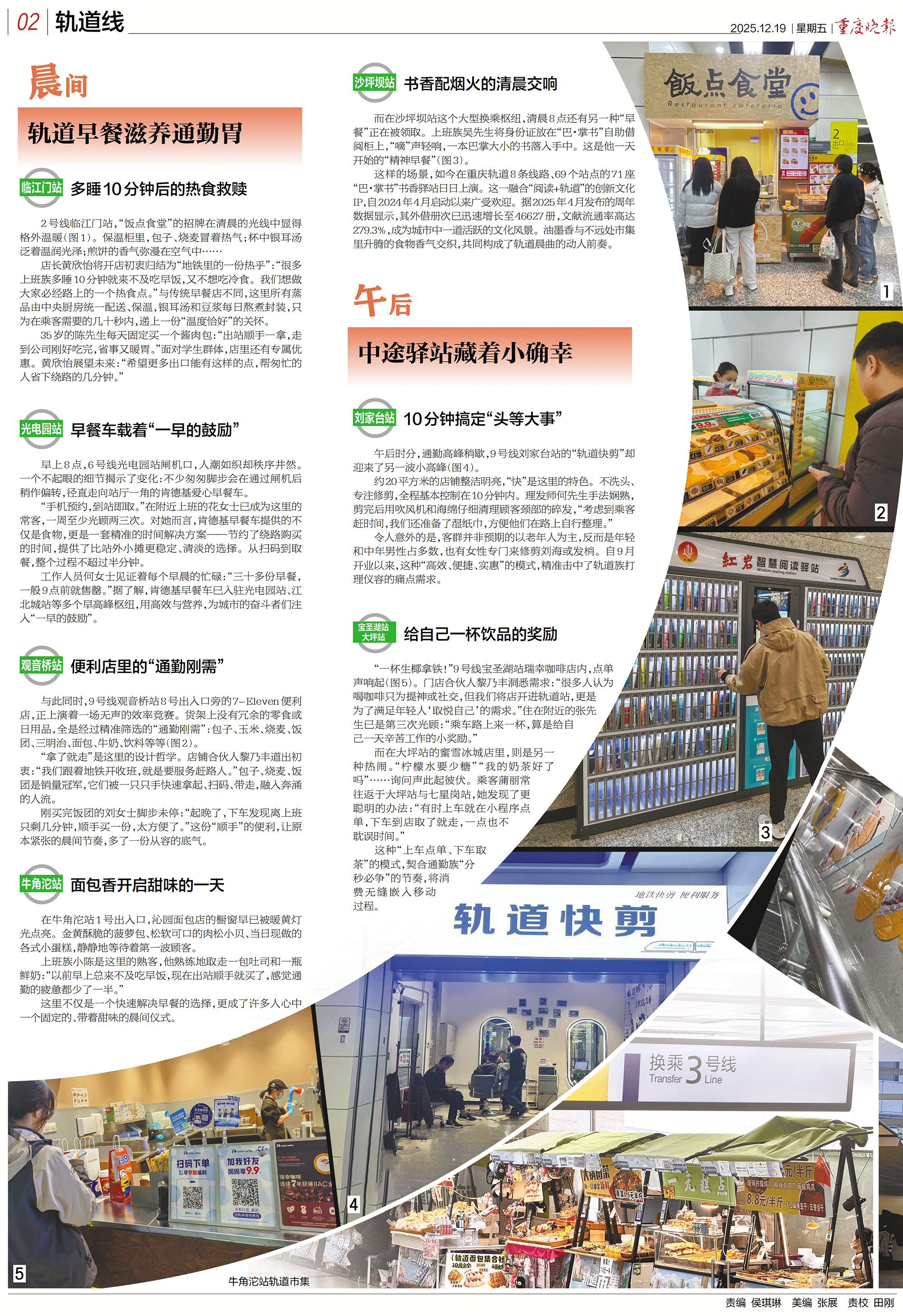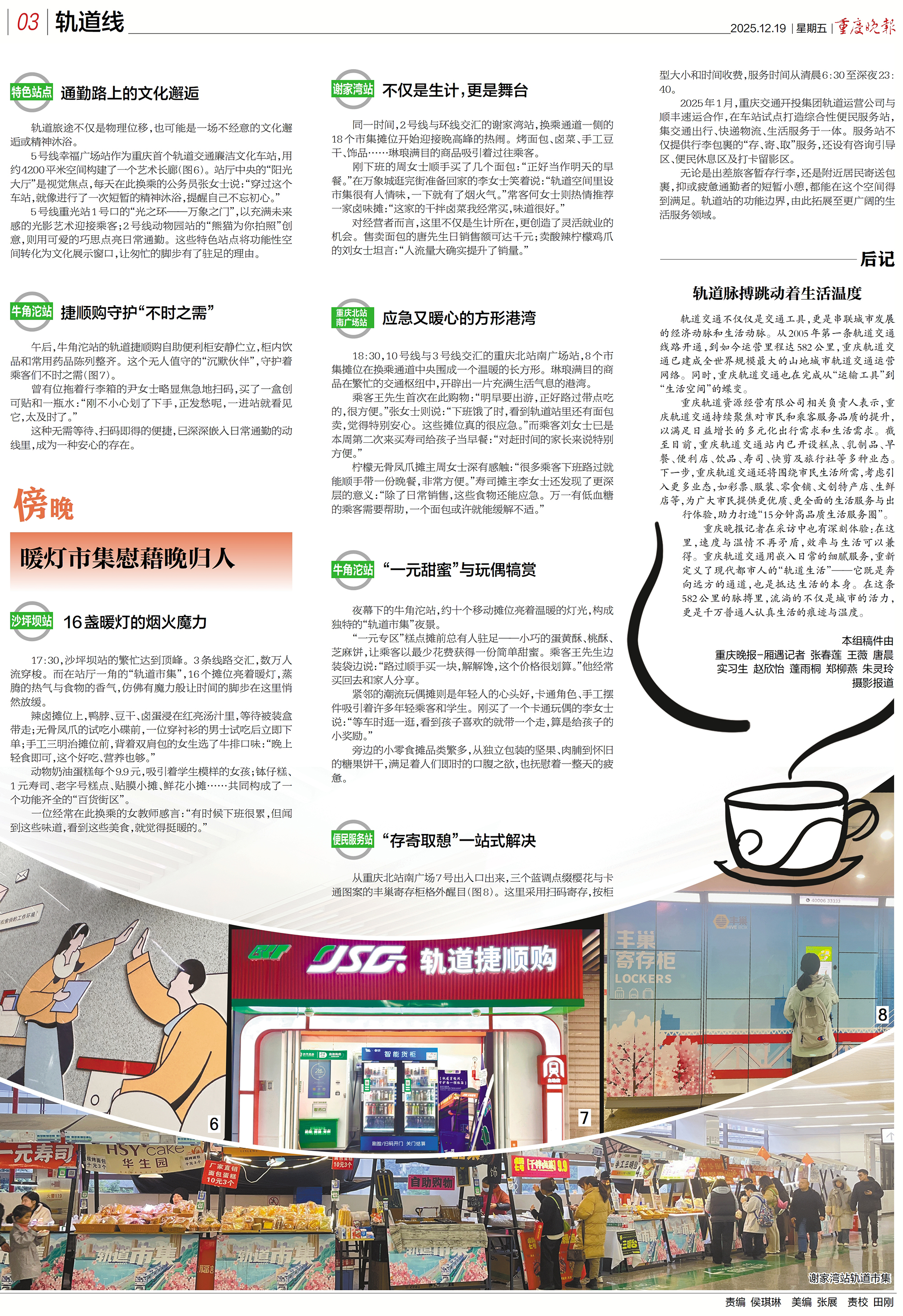 2025年1月,重庆交通开投集团轨道运营公司与顺丰速运合作,在车站试点打造综合性便民服务站,集交通出行、快递物流、生活服务于一体。服务站不仅提供行李包裹的“存、寄、取”服务,还设有咨询引导区、便民休息区及打卡留影区。 无论是出差旅客暂存行李,还是附近居民寄送包裹,抑或疲惫通勤者的短暂小憩,都能在这个空间得到满足。轨道站的功能边界,由此拓展至更广阔的生活服务领域。 后记 轨道脉搏跳动着生活温度 轨道交通不仅仅是交通工具,更是串联城市发展的经济动脉和生活动脉。从2005年第一条轨道交通线路开通,到如今运营里程达582公里,重庆轨道交通已建成全世界规模最大的山地城市轨道交通运营网络。同时,重庆轨道交通也在完成从“运输工具”到“生活空间”的蝶变。 重庆轨道资源经营有限公司相关负责人表示,重庆轨道交通持续聚焦对市民和乘客服务品质的提升,以满足日益增长的多元化出行需求和生活需求。截至目前,重庆轨道交通站内已开设糕点、乳制品、早餐、便利店、饮品、寿司、快剪及旅行社等多种业态。下一步,重庆轨道交通还将围绕市民生活所需,考虑引入更多业态,如彩票、服装、零食铺、文创特产店、生鲜店等,为广大市民提供更优质、更全面的生活服务与出行体验,助力打造“15分钟高品质生活服务圈”。 重庆晚报记者在采访中也有深刻体验:在这里,速度与温情不再矛盾,效率与生活可以兼得。重庆轨道交通用嵌入日常的细腻服务,重新定义了现代都市人的“轨道生活”——它既是奔向远方的通道,也是抵达生活的本身。在这条582公里的脉搏里,流淌的不仅是城市的活力,更是千万普通人认真生活的痕迹与温度。 本组稿件由重庆晚报-厢遇记者 张春莲 王薇 唐晨 实习生 赵欣怡 蓬雨桐 郑柳燕 朱灵玲 摄影报道 编辑:戴林 校审:罗再芳 总值班:周圆 重庆晚报报版鉴赏