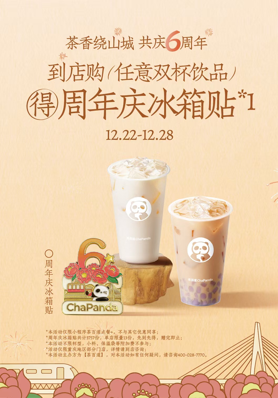 冬日山城,茶香四溢,为庆祝品牌入驻重庆六周年,茶百道于12月22日至28日推出专属店庆活动,诚邀广大市民共襄盛举。