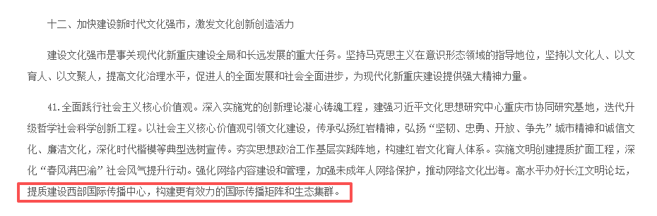 图:西部国际传播中心园区 荣誉背后:一支能打硬仗的国际传播团队 西部国际传播中心有一支政治坚定、业务精湛、作风过硬、勇于创新的专业队伍。2018年,成立全国第一个省级国际传播中心——重庆国际传播中心。2023年,迭代升级成立西部国际传播中心。中心发挥城市国际通讯社功能,每日生产发布上百条高质量原创英文融媒产品,成功运营海外用户超2300万的全球传播矩阵,iChongqing成为被国际权威平台Google搜索引擎收录的中国城市英文网站。荣获包括中国新闻奖在内的省部级以上重要奖项70余项。承担智博会、西洽会等大型国际活动新闻中心建设运营,运营“一带一路”记者驿站,主办高端国际论坛陆海财经论坛,执行“机遇中国 品牌重庆”全球宣传推广行动,在实战中锤炼了覆盖策划、采编、翻译、技术、运营的全链路国际传播能力,展现了强烈的使命担当与卓越的专业素养。 图:非洲媒体团走进西部国际传播中心“一带一路”记者驿站 战略升级:提质建设西部国际传播中心 在不久前公布的中共重庆市委关于制定重庆市国民经济和社会发展第十五个五年规划的建议中,明确提出“提质建设西部国际传播中心,构建更有效力的国际传播矩阵和生态集群”。这是继重庆市“十四五”规划提出“建设西部国际传播中心”后,中心建设又一次列入全市重大发展战略。国际传播工作已深度嵌入重庆打造内陆开放综合枢纽、建设新时代文化强市的整体布局,系统性跃升为服务国家战略、驱动城市开放、汇聚全球资源、塑造竞争优势的城市关键性基础设施和软实力支撑。 图:“提质建设西部国际传播中心,构建更有效力的国际传播矩阵和生态集群”写入重庆市“十五五”规划建议 未来发展:构建国际传播生态集群 根据规划指引,提质建设后的西部国际传播中心将致力于体系重构与生态构建:打破壁垒,形成全市贯通、内外联动的工作新格局;强化服务,通过升级Bridging News财经客户端、做优“老外in重庆”服务平台、拓展陆海财经论坛等,赋能经贸合作与优化营商环境;创新实践,推动双向对话、文明互鉴,持续运营好《Let‘s Meet》等品牌栏目;拓展园区聚合功能,促进国际传播、人文交流、智库研究、产业服务等多业态融合发展。目标是建设成为具有国际影响力、区域引领力的国际传播综合体,预计“十五五”期间海外用户实现显著增长,构建起更有效的国际传播矩阵和生态集群。 图:《Let’s Meet渝见》节目封面 原标题:西部国际传播中心荣获“全国宣传系统先进集体”称号 编辑:蒋丽霞 校审:张波 总值班:周圆 |