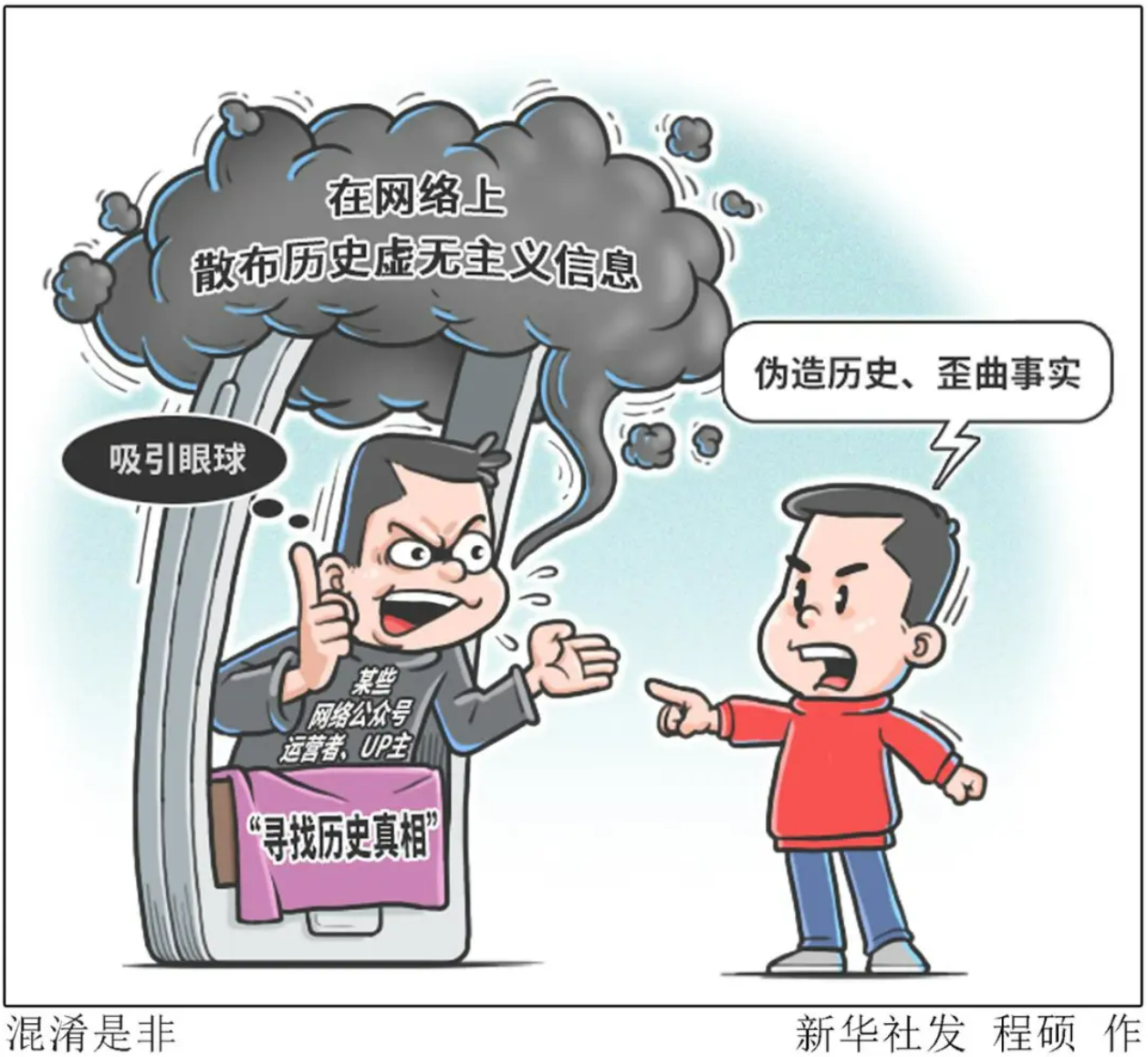 新华社图表 最近,《红楼梦》被异解为“悼明说”,极大模糊了虚构和真实的界限。种种历史虚无主义的表演,看似“创新表现”“标新立异”,实则颠倒黑白、篡史乱今。 历史虚无主义是一张“画皮”:它用“细节”否定“全局”,用“客观”包装“洗白”,用“调侃”替代“考证”,用“猎奇”消解“厚重”…… 这张“画皮”极具迷惑性和攻击性。它出现在哪里,哪里就滋生怀疑、戾气与对立;它真正的目标,是动摇、毁灭——人,对国家历史、民族身份、公共常识的基本信任。 它不是不讲历史,而是在用“怀疑一切,否定一切”的口吻歪讲历史——先模糊扭曲,让不明真相者陷入迷雾;再掏空搞臭,瓦解历史进程的正面价值;最后抹杀消除,破坏原有的普遍认同与集体敬畏。 坚持从整体出发,抓主要矛盾,认清主流价值,才能全面系统地反击历史虚无主义。