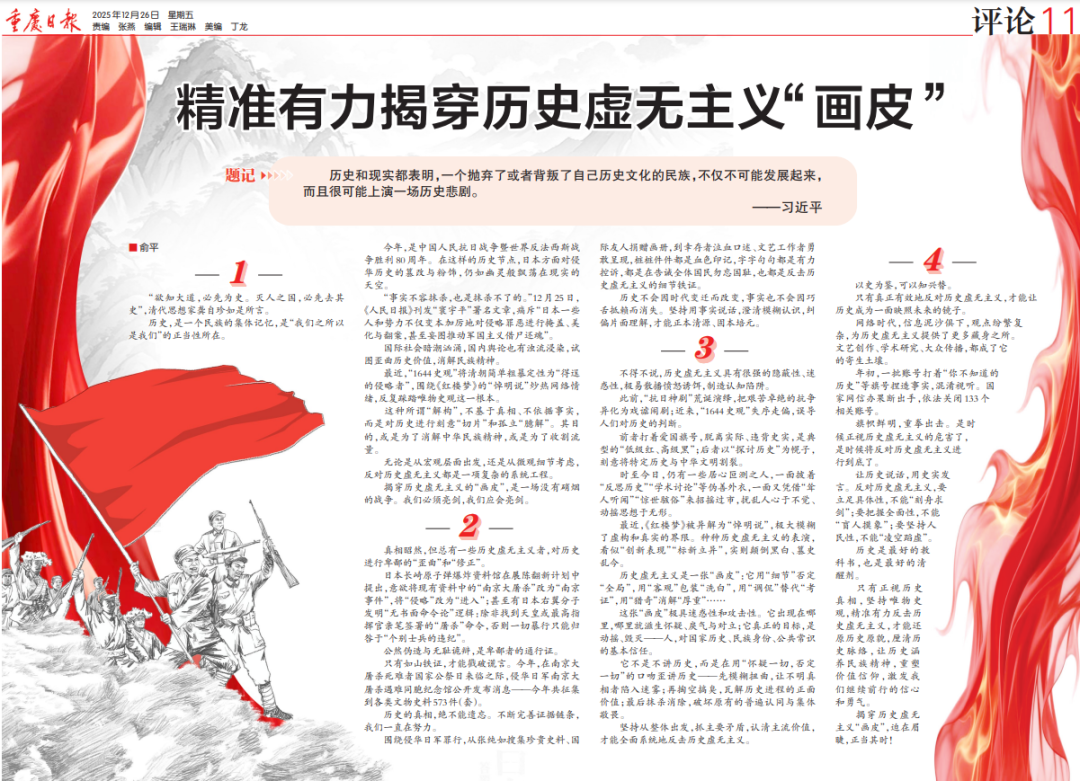 “欲知大道,必先为史。灭人之国,必先去其史”,清代思想家龚自珍如是所言。 历史,是一个民族的集体记忆,是“我们之所以是我们”的正当性所在。 今年,是中国人民抗日战争暨世界反法西斯战争胜利80周年。在这样的历史节点,日本方面对侵华历史的篡改与粉饰,仍如幽灵般飘荡在现实的天空。 “事实不容抹杀,也是抹杀不了的。”12月25日,《人民日报》刊发“寰宇平”署名文章,痛斥“日本一些人和势力不仅变本加厉地对侵略罪恶进行掩盖、美化与翻案,甚至妄图推动军国主义借尸还魂”。 国际社会暗潮汹涌,国内舆论也有浊流浸染,试图歪曲历史价值,消解民族精神。 最近,“1644史观”将清朝简单粗暴定性为“得逞的侵略者”,围绕《红楼梦》的“悼明说”炒热网络情绪,反复踩踏唯物史观这一根本。 这种所谓“解构”,不基于真相、不依据事实,而是对历史进行刻意“切片”和孤立“臆解”。其目的,或是为了消解中华民族精神,或是为了收割流量。 无论是从宏观层面出发,还是从微观细节考虑,反对历史虚无主义都是一项复杂的系统工程。 揭穿历史虚无主义的“画皮”,是一场没有硝烟的战争。我们必须亮剑,我们应会亮剑。