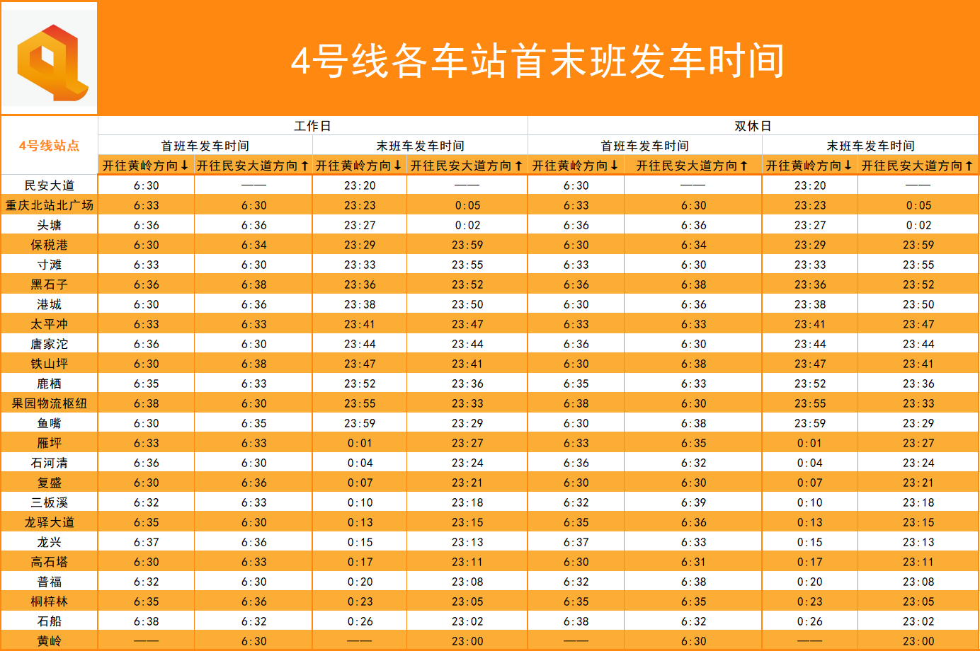 12月26日,记者从重庆轨道四号线建设运营有限公司获悉,为进一步满足乘客安全、便捷、舒适的出行需要,有效提升运营服务质量,12月29日起,重庆轨道交通4号线发车间隔将进行调整。 调整后,4号线工作日早晚高峰最小行车间隔缩短至7分30秒,工作日平峰时段、双休日行车间隔保持不变。 为适应发车间隔的调整,4号线在工作日期间最大上线列车数由20列增加至25列,高峰小时断面运能增加至12256人次/小时,运能提升33.33%。 重庆轨道四号线建设运营有限公司提醒,发车间隔调整后,4号线将启用新版列车运行图,各站发车时间也将有变动。各车站首末班车发车时间如下:
