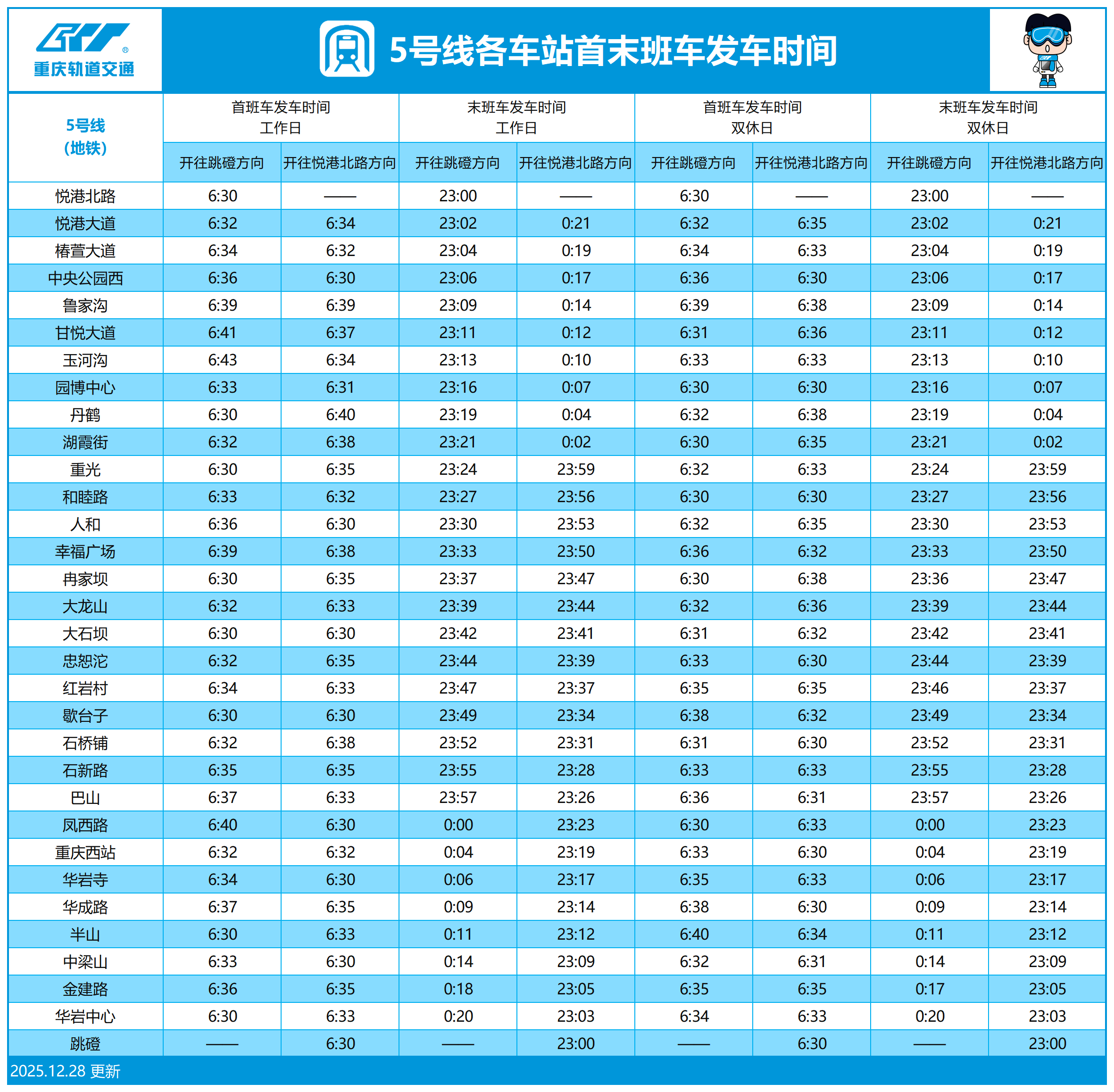 重庆交通开投集团轨道运营公司消息,为更好满足市民出行需求,12月28日起,重庆轨道交通5号线优化运营组织。 优化后,工作日6:30-9:00,5号线北延伸段开往跳磴方向的列车将由16列次增加至23列次,进一步提升运力。届时,悦港北路至园博中心段开往跳磴方向的列车平均候车时间将缩短约2分30秒,沿线乘客通勤出行更加便捷。 重庆交通开投集团轨道运营公司提醒乘客,此次调整将影响5号线的列车时刻表,各站点的具体发车时间将有变化。各车站首末班车发车时间如下: