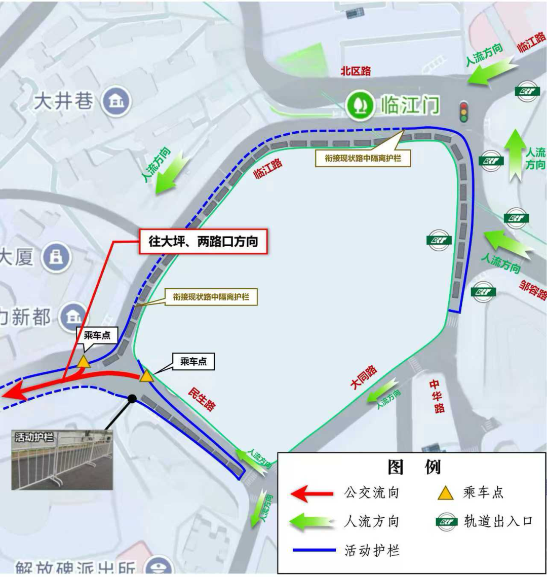 ▲前往两路口、大坪方向的可在此处乘车 临江路民生路路口 (前往两路口、大坪方向)
