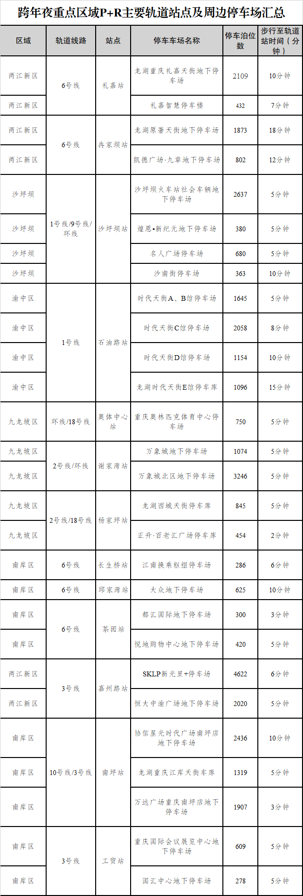 12月31日晚,“新韵重庆”无人机灯光秀将在两江四岸核心区上演。为保障道路交通安全有序,公安机关交通管理部门将对渝中区、南岸区、两江新区部分区域实施封控(12月31日17时至次日2时,禁止社会车辆通行停放、停车场暂停进出),对周边片区及6座桥梁设为管控区(12月31日17时起适时启动,实施分流绕行与限流)。 记者从重庆市停车管理事务中心获悉,本次跨年夜推出“P+R”停车换乘服务,覆盖5大区域共28个停车场(36420个停车位)。其中,两江新区6个停车场(11858个停车位)、沙坪坝区4个停车场(4060个停车位)、渝中区4个停车场(5953个停车位)、九龙坡区5个停车场(6369个停车位)、南岸区9个停车场(8180个停车位)。所有车场均已完善步行至轨道入口的指示标识(步行时间最短2分钟、最长18分钟),相关部门同步实现停车场饱和度数据共享,将通过“定制导航”实时推荐闲置车位,保障市民停车换乘顺畅。 为让您的跨年夜出行更顺畅舒心,倡导优先选择轨道交通绿色出行,公交线路将随管控动态调整,以官方后续通告为准。请广大交通参与者遵守管制规定,服从交警指挥及标志引导,共同维护交通秩序。不便之处,敬请理解支持。 详细停车场信息如下: