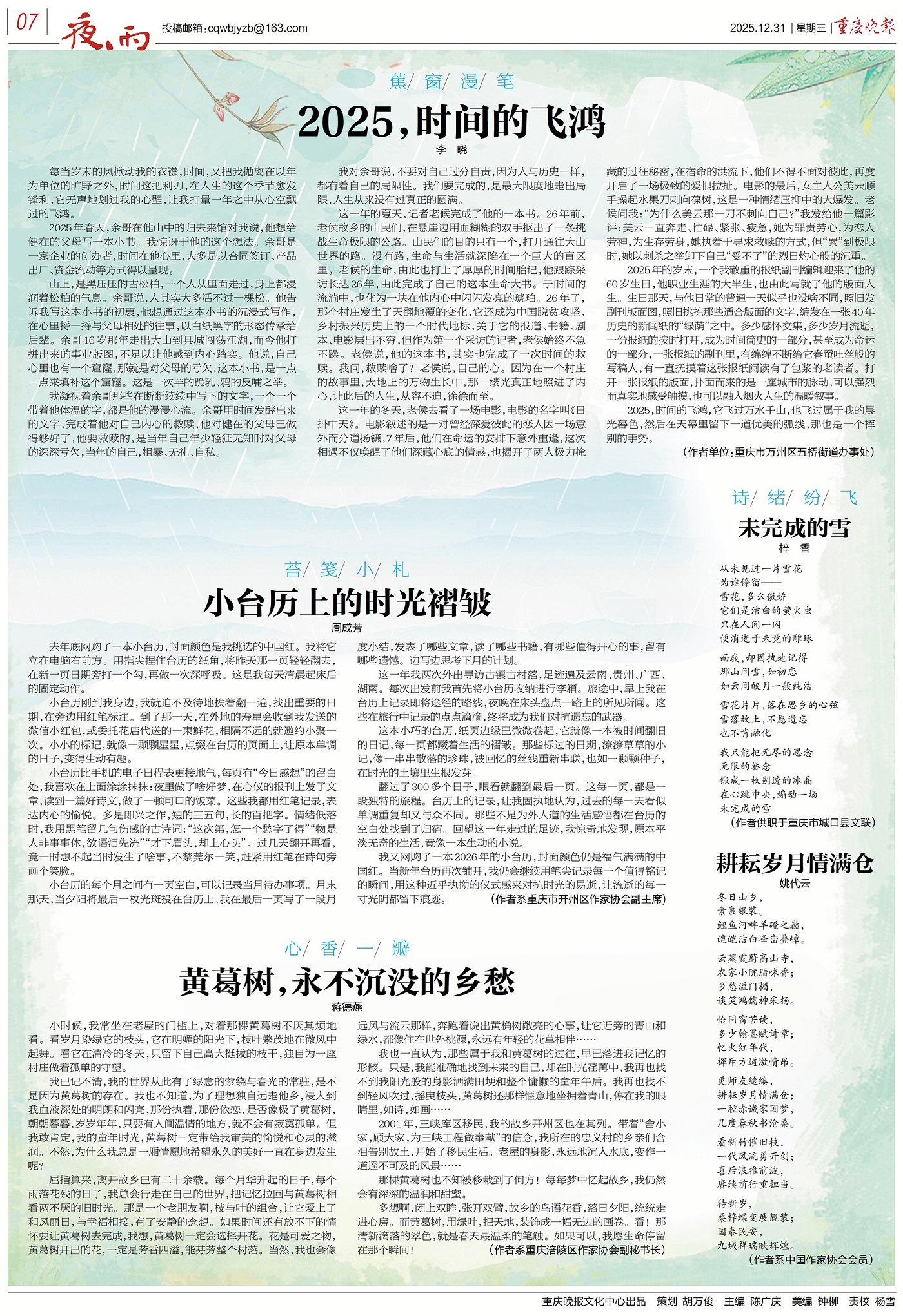 耕耘岁月情满仓 文/姚代云 冬日山乡, 素裹银装。 鲤鱼河畔羊磴之巅, 皑皑洁白峰峦叠嶂。 云蒸霞蔚高山寺, 农家小院腊味香; 乡愁溢门楣, 谈笑鸿儒神采扬。 恰同窗苦读, 多少翰墨赋诗章; 忆火红年代, 挥斥方遒激情昂。 更师友缱绻, 耕耘岁月情满仓; 一腔赤诚家国梦, 几度春秋书沧桑。 看新竹催旧枝, 一代风流勇开创; 喜后浪推前波, 赓续前行重担当。 待新岁, 桑梓蝶变展靓装; 国泰民安, 九域祥瑞映辉煌。 (作者系中国作家协会会员) 编辑:蒋丽霞 校审:罗再芳 总值班:周圆 重庆晚报夜雨版面赏析