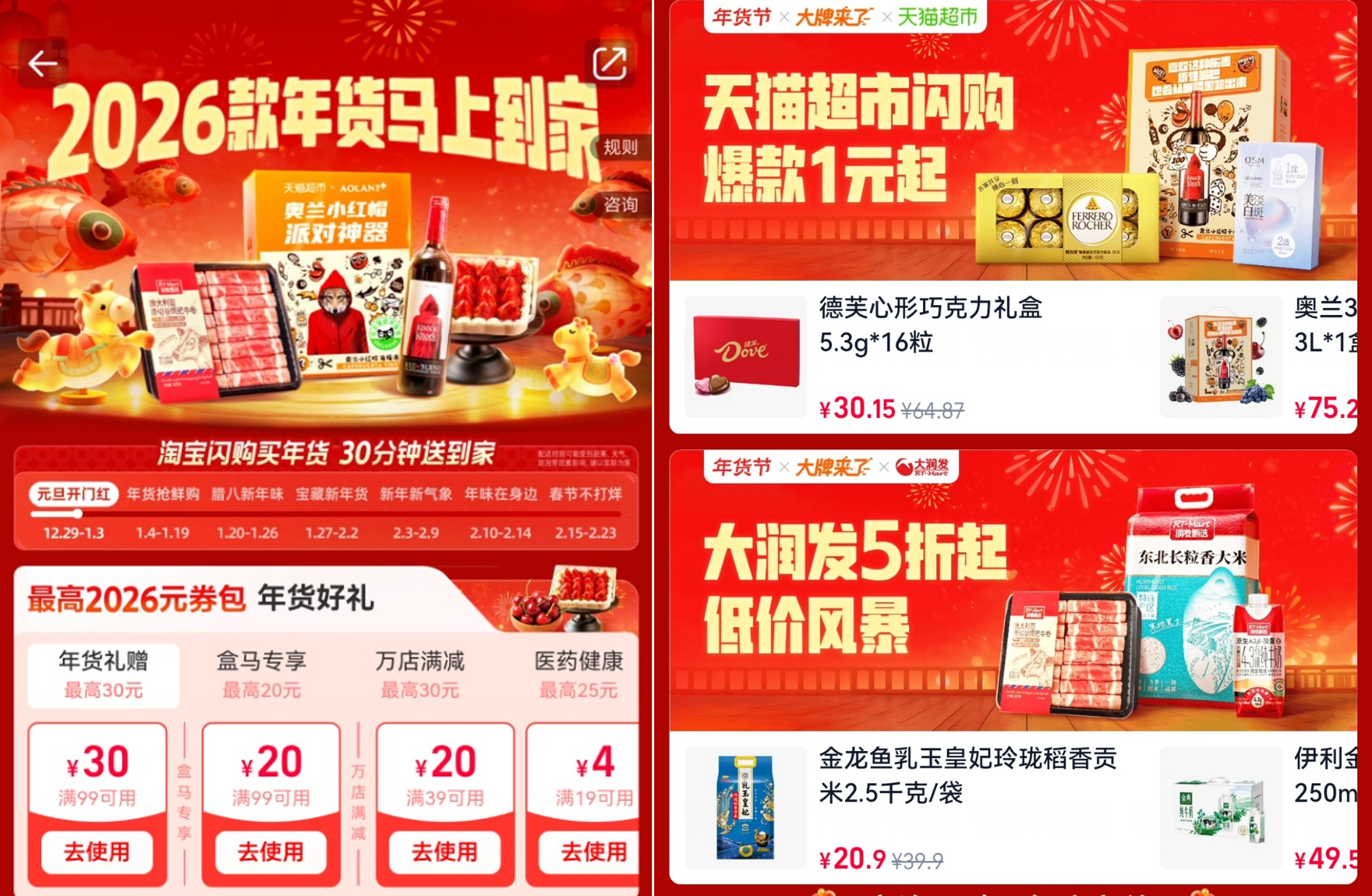 淘宝闪购近日正式启动2026年货节,以“淘宝闪购买年货,30分钟送到家”为核心主张,围绕团聚、出行、礼赠、装扮玩乐四大高频场景推出年货购物解决方案。 随着年轻用户成为消费主力,年货采购正从过往以家庭为单位的“集中囤货”,转向更个人化、场景化的“即时满足”。如今的年货不再是节前统一备货的“库存商品”,而成为融入日常、随时可得的品质选择。 基于这一洞察,淘宝闪购年货节于12月底提前开启,通过整合盒马鲜生、天猫超市的优质商品供给,并联合大润发、沃尔玛等大型连锁商超,百果园、酒小二、吉列等知名品牌,共同推出多款新年节日爆款及冬季时令大单品。智利车厘子、红颜草莓礼盒、鲜活波士顿龙虾、澳洲和牛肥牛卷、榴莲千层等品质食材,以及“马上有钱”银柳福桶、新年玫瑰花束等节庆好物悉数上线,覆盖送礼、聚会、节日布置等多元场景,消费者30分钟即可一站式购齐所需年货。 据悉,活动期间,用户搜索“年货节”进入会场,可领取最高2026元的券包,用户领券下单可享受多档满减优惠,覆盖百货、超市、酒水、生鲜等全品类商家。