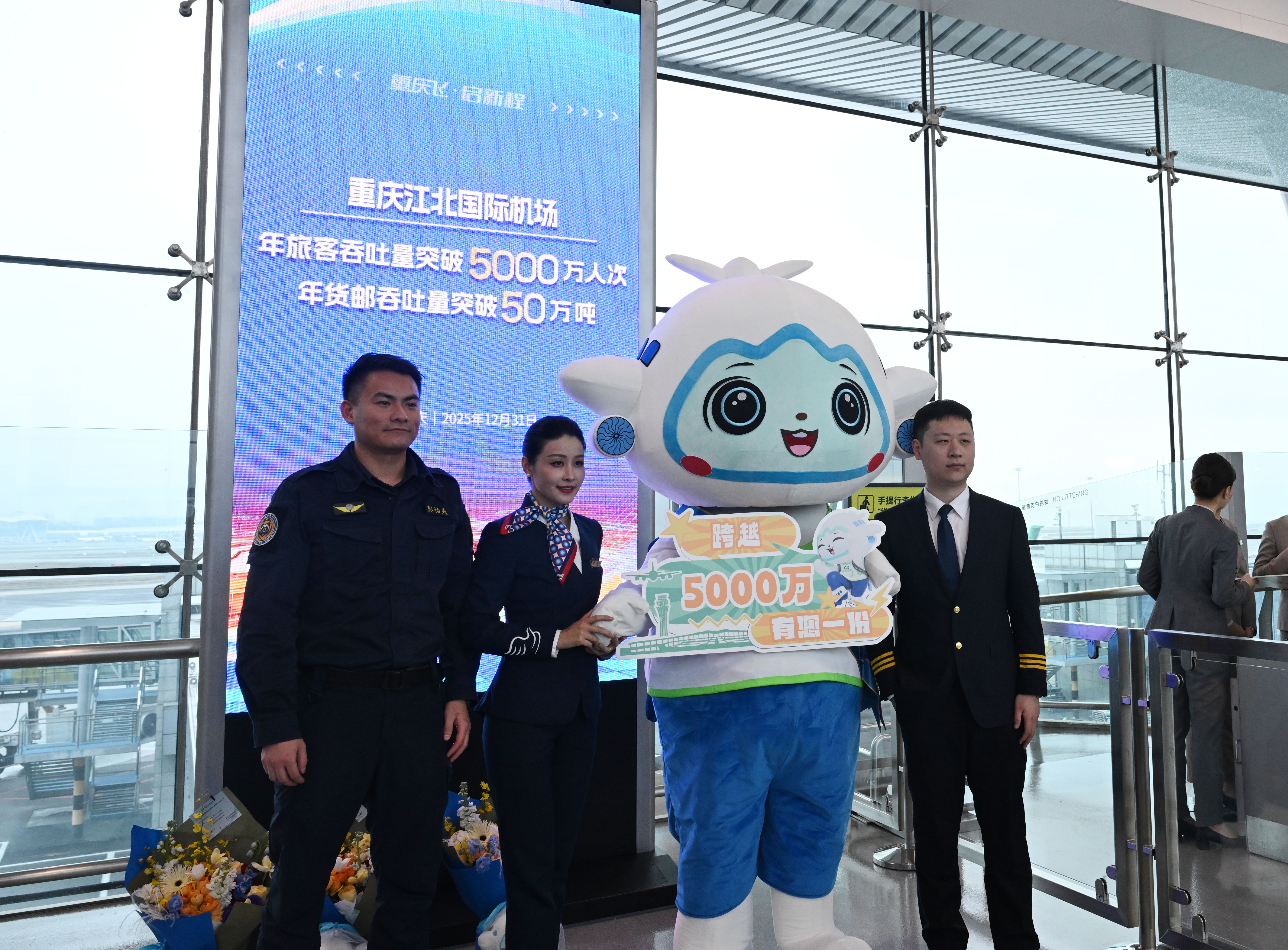 ▲2025年12月31日,重庆江北国际机场T3A航站楼,工作人员在海报墙合影留念,庆祝旅客吞吐量首次突破5000万人次。 记者 罗斌 摄/视觉重庆 重庆江北国际机场相关负责人介绍,T3B航站楼全覆盖自助办票、刷证安检、扫脸登机等智能服务,配备无线充电、休闲躺椅等便民设施;全球首个全自动无人驾驶跨座式单轨捷运系统连接T3A与T3B,3分钟实现高效联动;T3航站楼10号线出口层新增值机安检区,实现手续通办。 口岸服务更加高效便捷。据介绍,海关、边防等联检单位高质量高标准落实通关便利举措,重庆海关持续优化监管流程,更新升级智慧化查验装备,充分运用智能审图、先期机检等科技手段,保障进出境旅客通关“零延时”;重庆边防总站严格落实240小时过境免签便利政策,开设免签过境临时入境许可专区,推行预约申报、即到即办、一次办结等便民举措,专设境外旅游团专用通道,以高效便捷的口岸服务打通入境游客“第一关”。 2025年5月投用的重庆江北国际机场入境服务中心,打造“综合咨询+支付、通信、交通、文旅”一站式智能平台,助力重庆建设国际消费中心城市和国际旅游目的地,让入境旅客深度畅游山城、打卡两江四岸、体验巴渝风情,实现口岸流量向文旅消费转化。 织密“流量”网络 激活客货联动引擎 硬件升级为航线拓展铺路,完善的客货运网络成为吞吐量增长核心引擎。前不久,重庆江北国际机场年货邮吞吐量突破50万吨,创下历史新高。