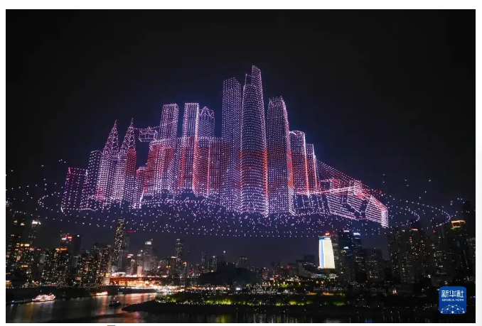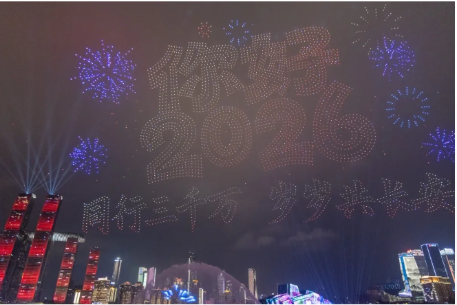 从重庆到上海,从常州到大理,今年跨年夜,很多城市都通过一场无人机光影盛宴,为人们献上了浪漫的新年祝福。 新年前夕,国家主席习近平发表的二〇二六年新年贺词中,特别提到了“无人机演绎绚丽‘烟花’”。这既是对科技与艺术融合创新的高度肯定,也象征着新时代中国蓬勃向上的生机与活力。 自去年4月起,每逢周六与节假日,重庆中心城区两江四岸核心区常态化上演的“新韵重庆”无人机灯光秀,已成为重庆的一张文化新名片,吸引了广泛关注。 创新创造催生了新质生产力,也让生活更加多姿多彩。一场场山城“赛博烟花”,以其独特的魅力,重新定义了现代城市的夜间美学,也为节庆氛围注入了中国式的“硬核”浪漫。 光影聚气,解锁节日文旅的新玩法 节日的核心是欢聚,而山城无人机灯光秀,则成为激活节日文旅市场的新“流量密码”,让重庆的每个节假日都充满烟火气与仪式感。 自去年四月常态化演出后,无人机灯光秀便成了重庆的新晋“顶流”。山城常态化开办的无人机表演,虽只有短短的20分钟,却因其极具辨识度的科技范、艺术风、山城韵,吸引着大量市民和游客驻足仰望。2025年,其现场观看人数超600万人次。 线下火热,线上同样沸腾。社交平台上,无人机表演的精彩片段被市民游客自发传播,“打卡-分享-引流”的传播链条,让重庆无人机表演等话题迅速引发关注,也让重庆进一步出圈。截至去年8月,相关话题全网累计阅读量超60亿,成为名副其实的城市文化新名片。 烟火气升腾之处,正是夜间经济蓬勃之时,“新韵重庆”无人机灯光秀的火爆,也带动了消费的火热。数据显示,无人机项目通过“观演套餐”与消费券的政策工具联动,在去年“五一”国际劳动节期间直接撬动文旅消费超10亿元。 更深层的价值,还藏在“光影+”的跨界融合中。如今,无人机表演能替代部分传统楼宇广告、LED广告,成为新兴的空中宣传形式。重庆无人机表演项目在长安汽车、腾讯等头部企业参与下,构建了“品牌植入-商业反哺-文化传播”的闭环运营模式,为项目可持续发展注入市场活力。 从直接激活夜间文旅市场,到带火周边餐饮住宿,再到拓展品牌广告新形态,重庆的实践证明,无人机灯光秀已超越单一观赏功能,形成了“一场表演、带动一片”的产业联动效应。