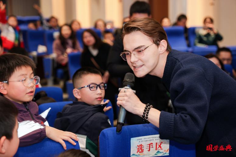 ▲安东·波特列耶夫和现场同学们进行成语互动交流 随后,现场迎来一位特别的文化交流使者——来自俄罗斯、就读于四川外国语大学的安东?波特列耶夫。作为上海合作组织国家多功能经贸平台教育工作联盟的优秀青少年代表,他以字正腔圆的中文进行了精彩发言,并走进观众席与小选手们进行了一场生动的成语互动,赢得现场阵阵掌声。这一环节生动诠释了成语作为中华文化瑰宝,所具有的超越语言的亲和力与连接力,成为整场活动国际交流的鲜明注脚。 传统文化的崭新时代内涵