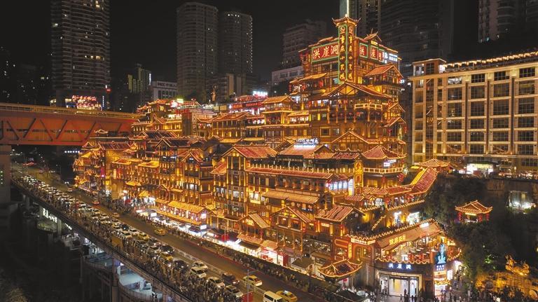 ▲传统的光晕,在洪崖洞的飞檐翘角上流转。层层叠叠的吊脚楼被暖黄的灯光勾勒得通体剔透,宛如一座从江岸崖壁上生长出的黄金宫殿,璀璨而梦幻。覃安松 摄
